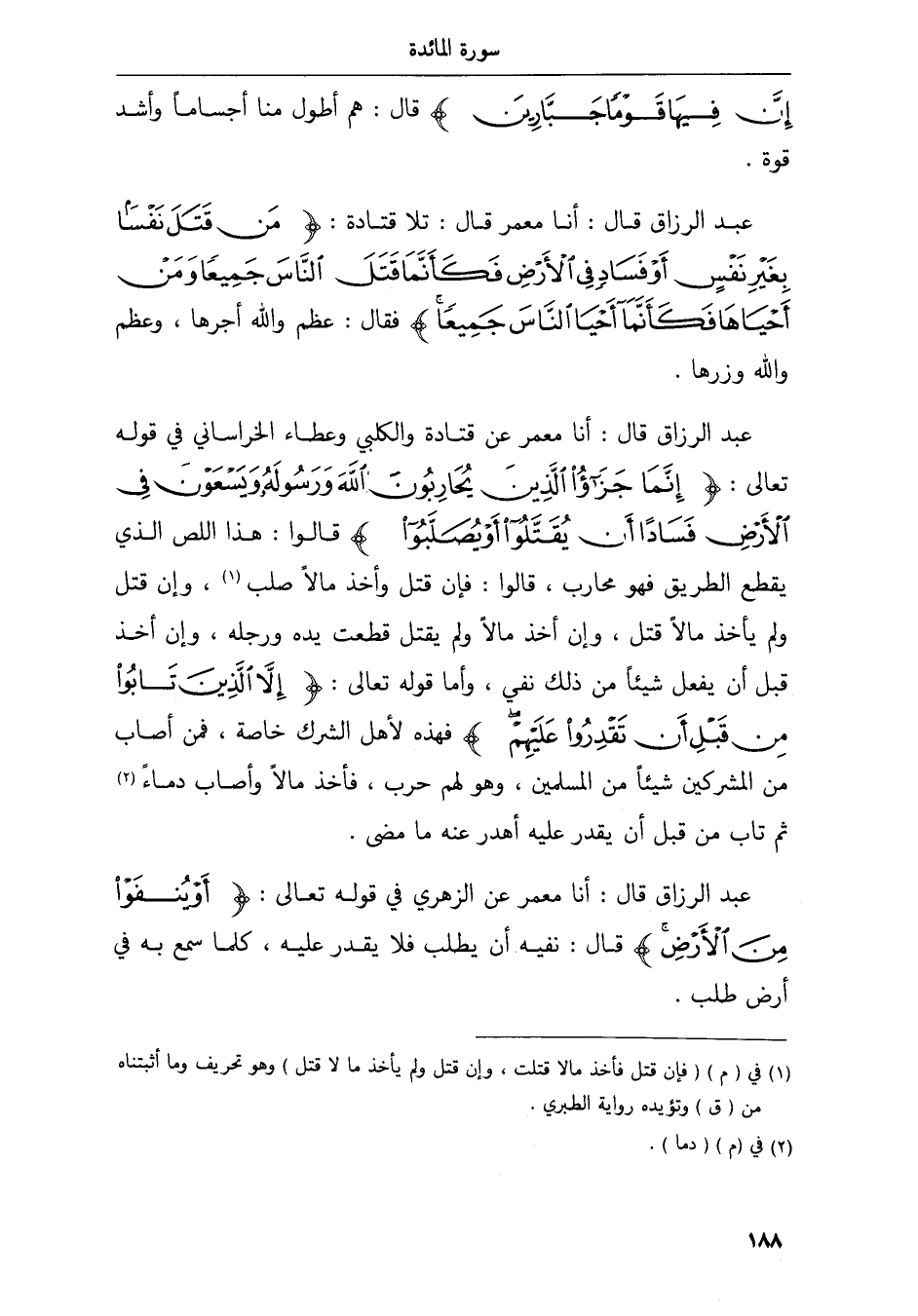عبد الرزاق قال أنا معمر عن قتادة والكلبي وعطاء الخراساني في قوله تعالى إنما جزؤا الذين يحاربون الله ورسوله ويسعون في الأرض فسادا أن يقتلوا أو يصلبوا قالوا هذا اللص الذي يقطع الطريق فهو محارب قالوا فإن قتل وأخذ مالا صلب وإن قتل ولم يأخذ مالا قتل وإن أخذ مالا ولم يقتل قطعت يده ورجله وإن أخذ قبل أن يفعل شيئا من ذلك نفي وأما قوله تعالى إلا الذين تابوا من قبل أن تقدروا عليهم فهذه لأهل الشرك خاصة فمن أصاب من المشركين شيئا من المسلمين وهو لهم حرب فأخذ مالا وأصاب دماء ثم تاب من قبل أن يقدر عليه أهدر عنه ما مضى