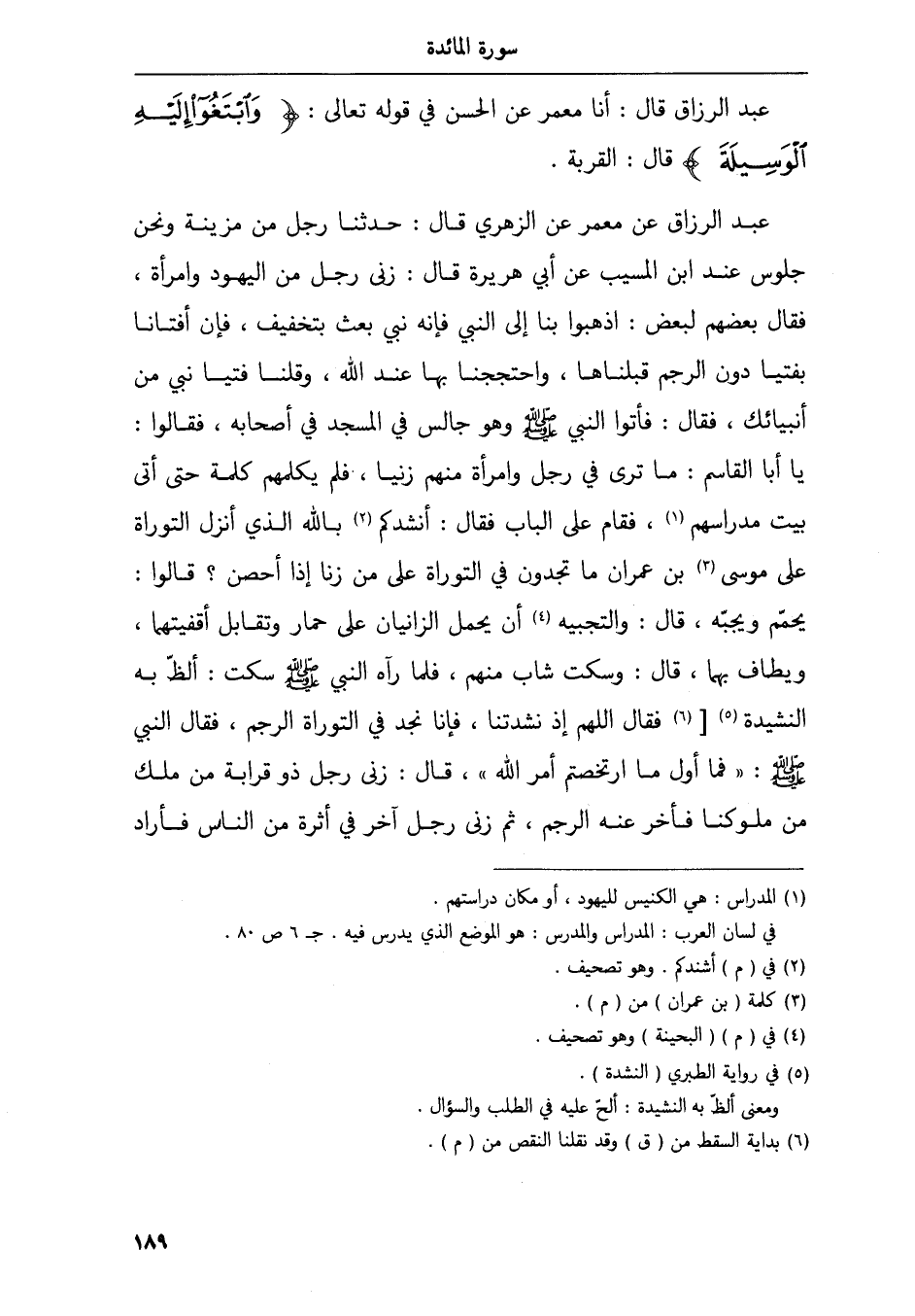 عبد الرزاق عن معمر عن الزهري قال حدثنا رجل من مزينة ونحن جلوس عند ابن المسيب عن أبي هريرة قال زنى رجل من اليهود وامرأة فقال بعضهم لبعض اذهبوا بنا إلى النبي فإنه نبي بعث بتخفيف فإن أفتانا بفتيا دون الرجم قبلناها واحتججنا بها عند الله وقلنا فتيا نبي من أنبيائك فقال فأتوا النبي وهو جالس في المسجد في أصحابه فقالوا يا أبا القاسم ما ترى في رجل وامرأة منهم زنيا فلم يكلمهم كلمة حتى أتى بيت مدراسهم فقام على الباب فقال أنشدكم بالله الذي أنزل التوراة على موسى بن عمران ما تجدون في التوراة على من زنا إذا أحصن قالوا يحمم ويجبه قال والتجبيه أن يحمل الزانيان على حمار وتقابل أقفيتهما ويطاف بهما قال وسكت شاب منهم فلما رآه النبي سكت ألظ به النشيدة فقال اللهم إذ نشدتنا فإنا نجد في التوراة الرجم فقال النبي فما أول ما ارتخصتم أمر الله قال زنى رجل ذو قرابة من ملك من ملوكنا فأخر عنه الرجم ثم زنى رجل آخر في أثرة من الناس فأراد