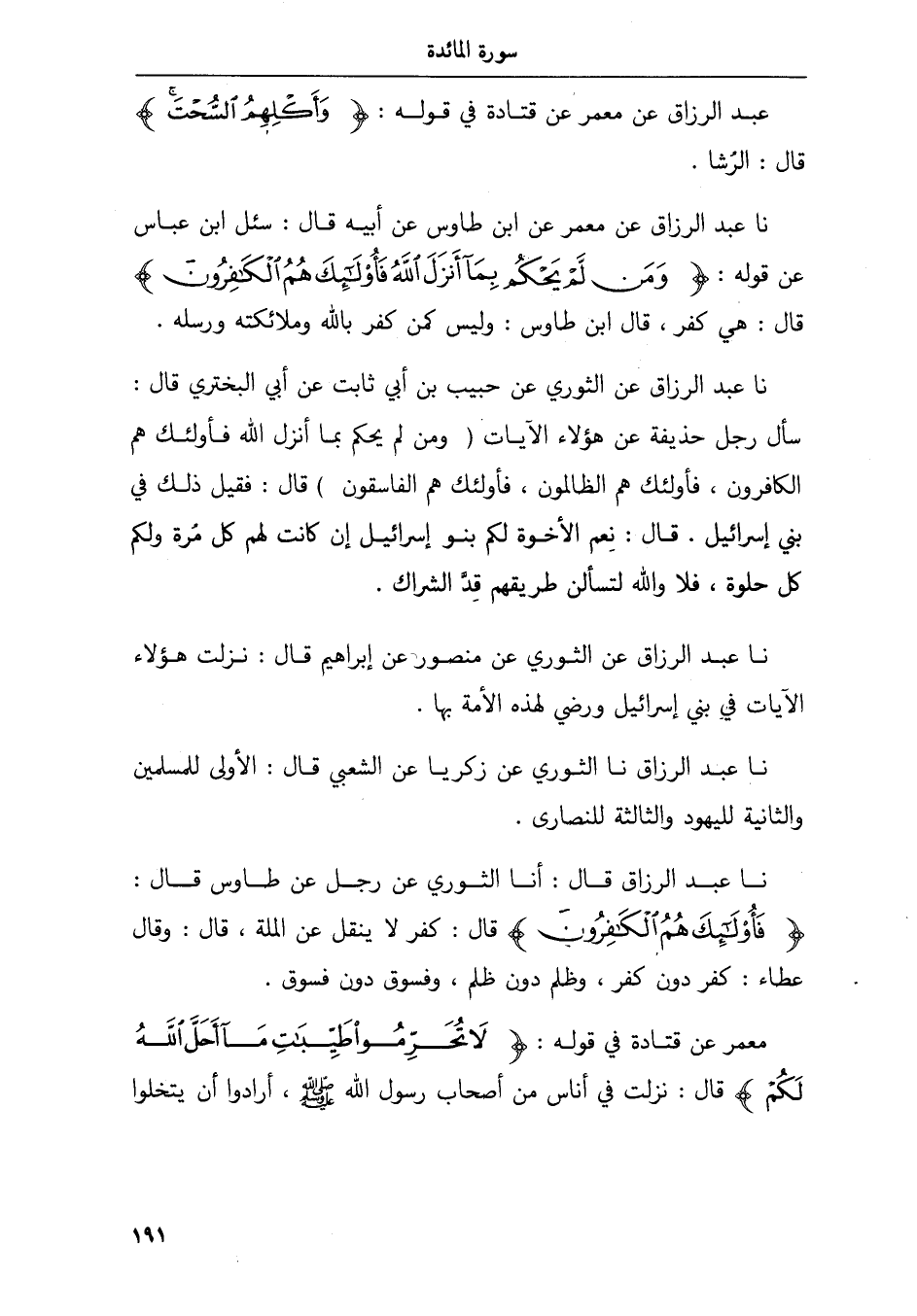 نا عبد الرزاق قال أنا الثوري عن رجل عن طاوس قال فأولئك هم الكفرون قال كفر لا ينقل عن الملة قال وقال عطاء كفر دون كفر وظلم دون ظلم وفسوق دون فسوق