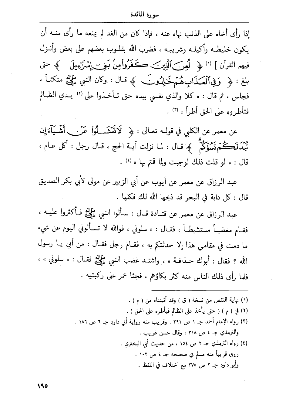 إذا رأى أخاه على الذنب نهاه عنه فإذا كان من الغد لم يمنعه ما رأى منه أن يكون خليطه وأكيله وشريبه فضرب الله بقلوب بعضهم على بعض وأنزل الله فيهم القرآن لعن الذين كفروا من بني إسرائيل حتى بلغ وفي العذاب هم خلدون قال وكان النبي متكئا فجلس ثم قال كلا والذي نفسي بيده حتى تأخذوا على يدي الظالم فتأطروه على الحق أطرا