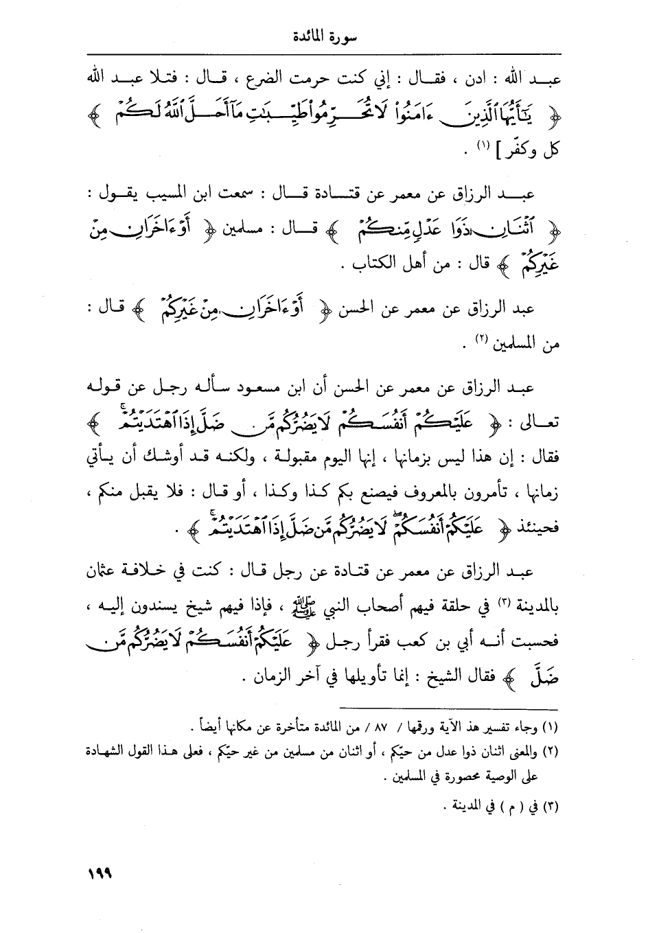 عبد الرزاق عن معمر عن قتادة عن رجل قال كنت في خلافة عثمان بالمدينة في حلقة فيهم أصحاب النبي فإذا فيهم شيخ يسندون إليه فحسبت أنه أبي بن كعب فقرأ رجل عليكم أنفسكم لا يضركم من ضل فقال الشيخ إنما تأويلها في آخر الزمان