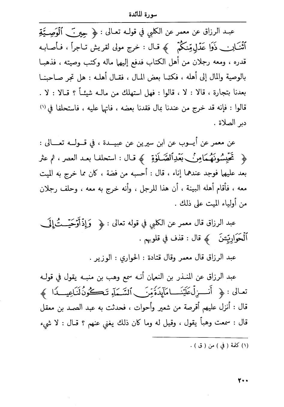 عبد الرزاق عن معمر عن الكلبي في قوله تعالى حين الوصية اثنان ذوا عدل منكم قال خرج مولى لقريش تاجرا فأصابه قدره ومعه رجلان من أهل الكتاب فدفع إليهما ماله وكتب وصيته فذهبا بالوصية والمال إلى أهله فكتما بعض المال فقال أهله هل تجر صاحبنا بعدنا بتجارة قالا لا قالوا فهل استهلك من ماله شيئا قالا لا قالوا فإنه قد خرج من عندنا بمال فقدنا بعضه فاتهما عليه فاستحلفا في دبر الصلاة