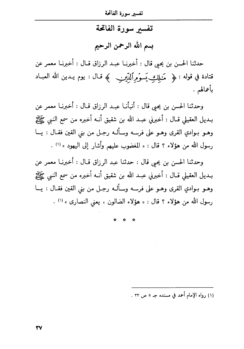 وحدثنا الحسن بن يحيى قال حدثنا عبد الرزاق قال أخبرنا معمر عن بديل العقيلي قال أخبرني عبد الله بن شقيق أنه أخبره من سمع النبي وهو بوادي القرى وهو على فرسه وسأله رجل من بني القين فقال يا رسول الله من هؤلاء قال هؤلاء الضالون يعني النصارى