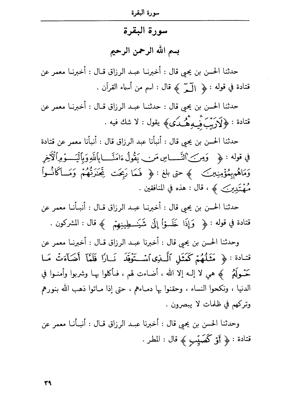 حدثنا الحسن بن يحيى قال أخبرنا عبد الرزاق قال أخبرنا معمر عن قتادة في قوله الم قال اسم من أسماء القرآن