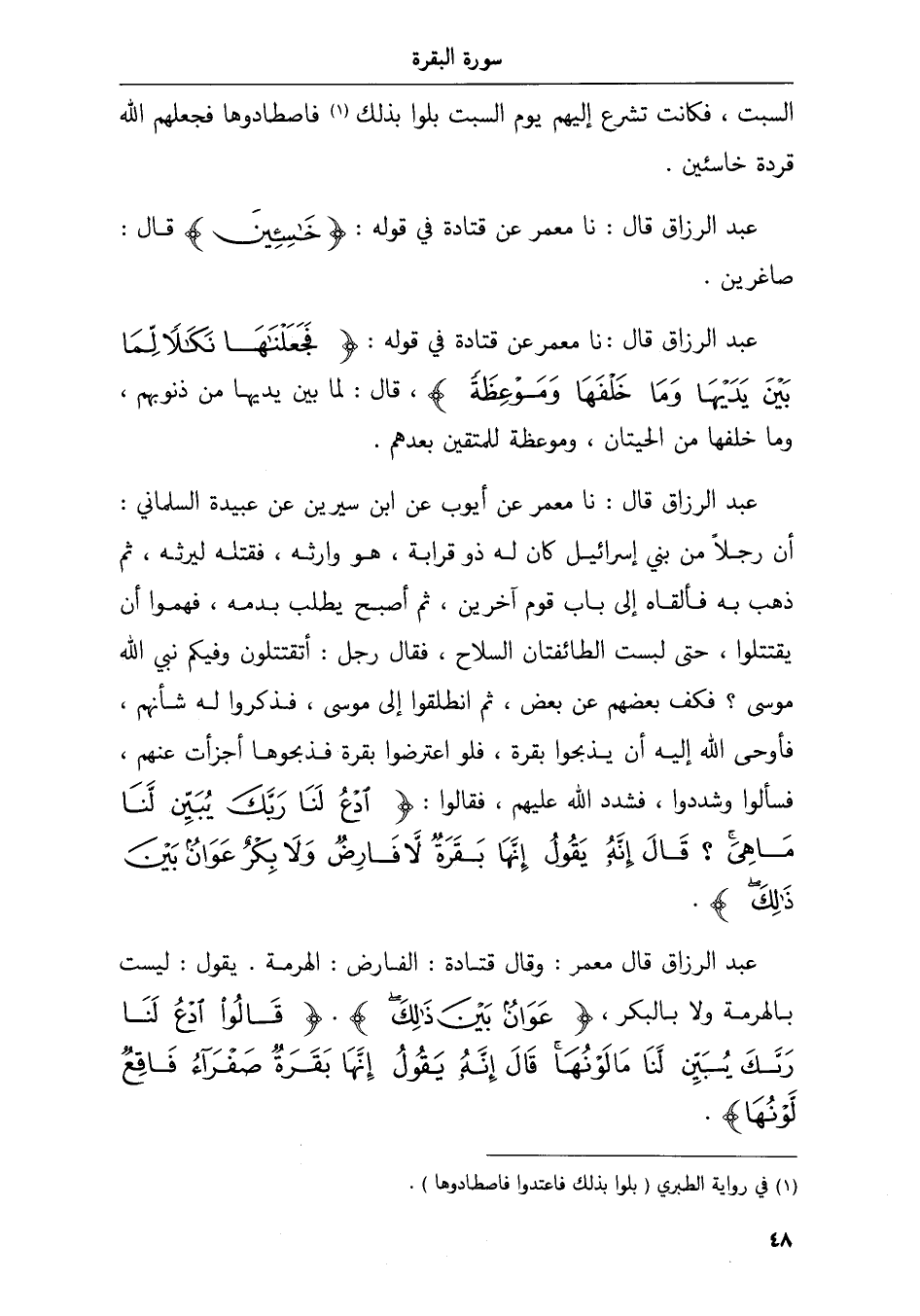 عبد الرزاق قال نا معمر عن أيوب عن ابن سيرين عن عبيدة السلماني أن رجلا من بني إسرائيل كان له ذو قرابة هو وارثه فقتله ليرثه ثم ذهب به فألقاه إلى باب قوم آخرين ثم أصبح يطلب بدمه فهموا أن يقتتلوا حتى لبست الطائفتان السلاح فقال رجل أتقتتلون وفيكم نبي الله موسى فكف بعضهم عن بعض ثم انطلقوا إلي موسى فذكروا له شأنهم فأوحى الله إليه أن يذبحوا بقرة فلو اعترضوا بقرة فذبحوها أجزأت عنهم فسألوا وشددوا فشدد الله عليهم فقالوا ادع لنا ربك يبين لنا ما هي قال إنه يقول إنها بقرة لا فارض ولا بكر عوان بين ذلك
