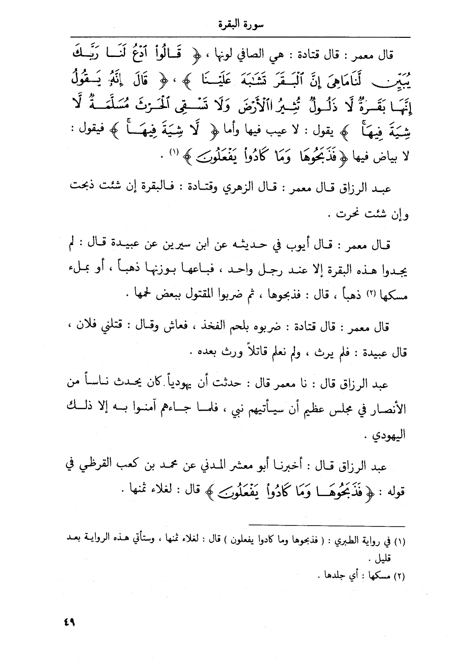 عبد الرزاق قال أخبرنا أبو معشر المدني عن محمد بن كعب القرظي في قوله فذبحوها وما كادوا يفعلون قال لغلاء ثمنها