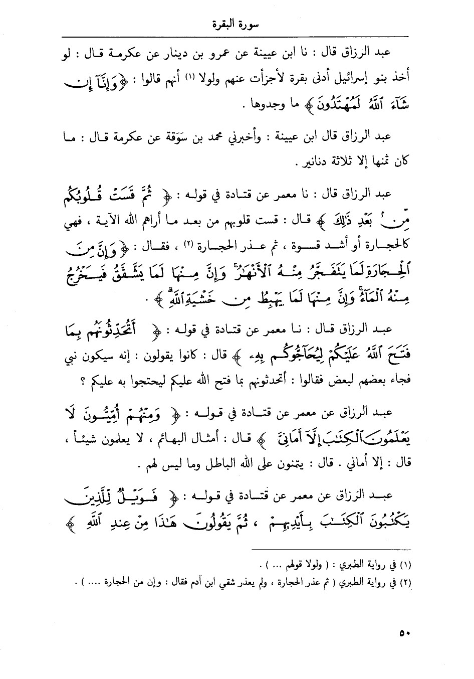عبد الرزاق قال نا معمر عن قتادة في قوله ثم قست قلوبكم من بعد ذلك قال قست قلوبهم من بعد ما أراهم الله الآية فهي كالحجارة أو أشدة قسوة ثم عذر الحجارة فقال وإن من الحجارة لما يتفجر منه الأنهار وإن منها لما يشقق فيخرج منه الماء وإن منها لما يهبط من خشية الله