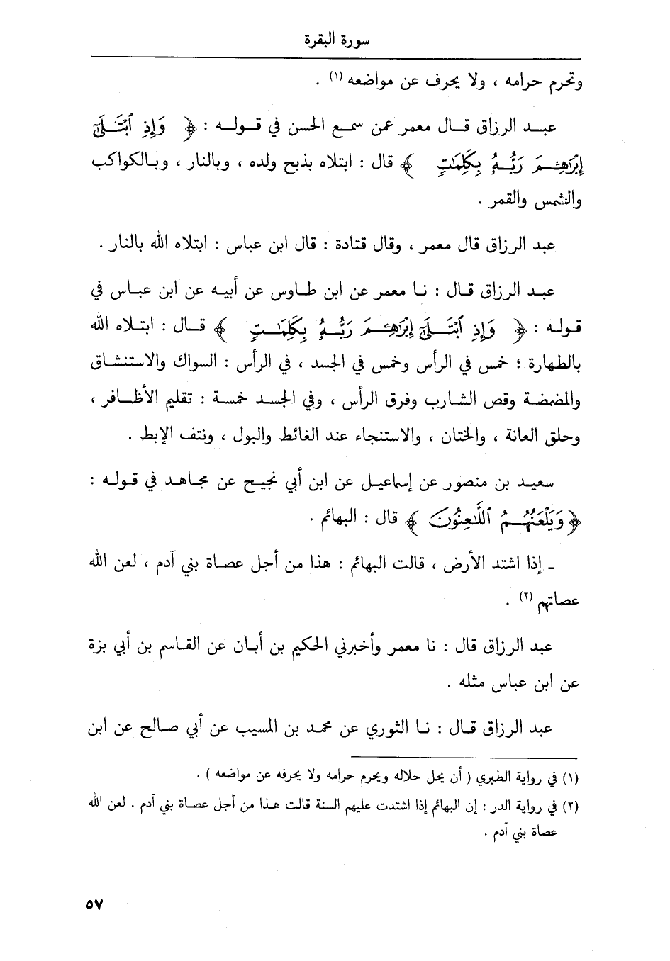 عبد الرزاق قال معمر عمن سمع الحسن في قوله وإذ ابتلى إبراهيم ربة بكلمت قال ابتلاه بذبح ولده وبالنار وبالكواكب والشمس والقمر