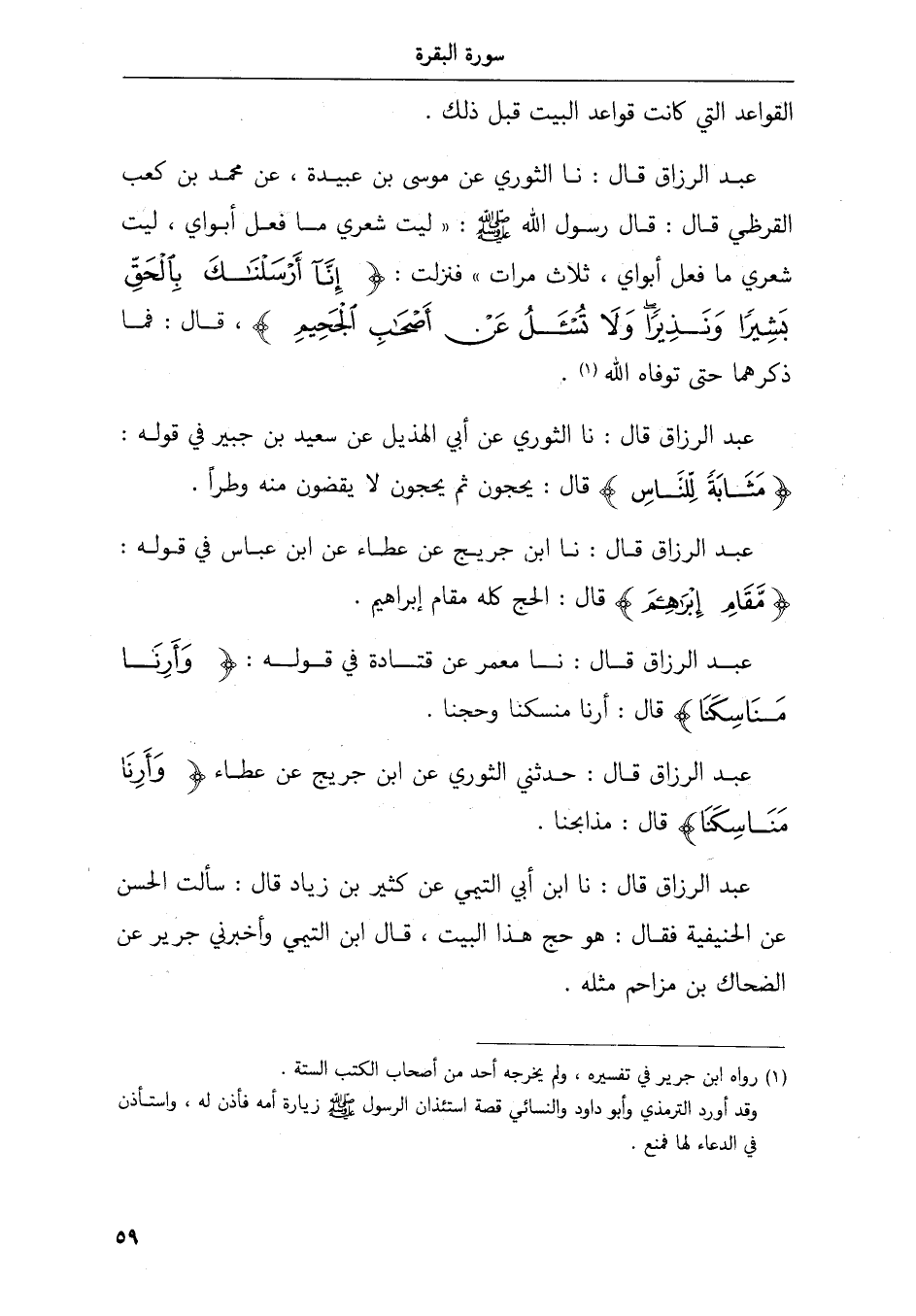 عبد الرزاق قال نا الثوري عن موسى بن عبيدة عن محمد بن كعب القرظي قال قال رسول الله ليت شعري ما فعل أبواي ليت شعري ما فعل أبواي ثلاث مرات فنزلت إنا أرسلنك بالحق بشيرا ونذيرا ولا تسئل عن أصحب الجحيم قال فما ذكرهما حتى توفاه الله