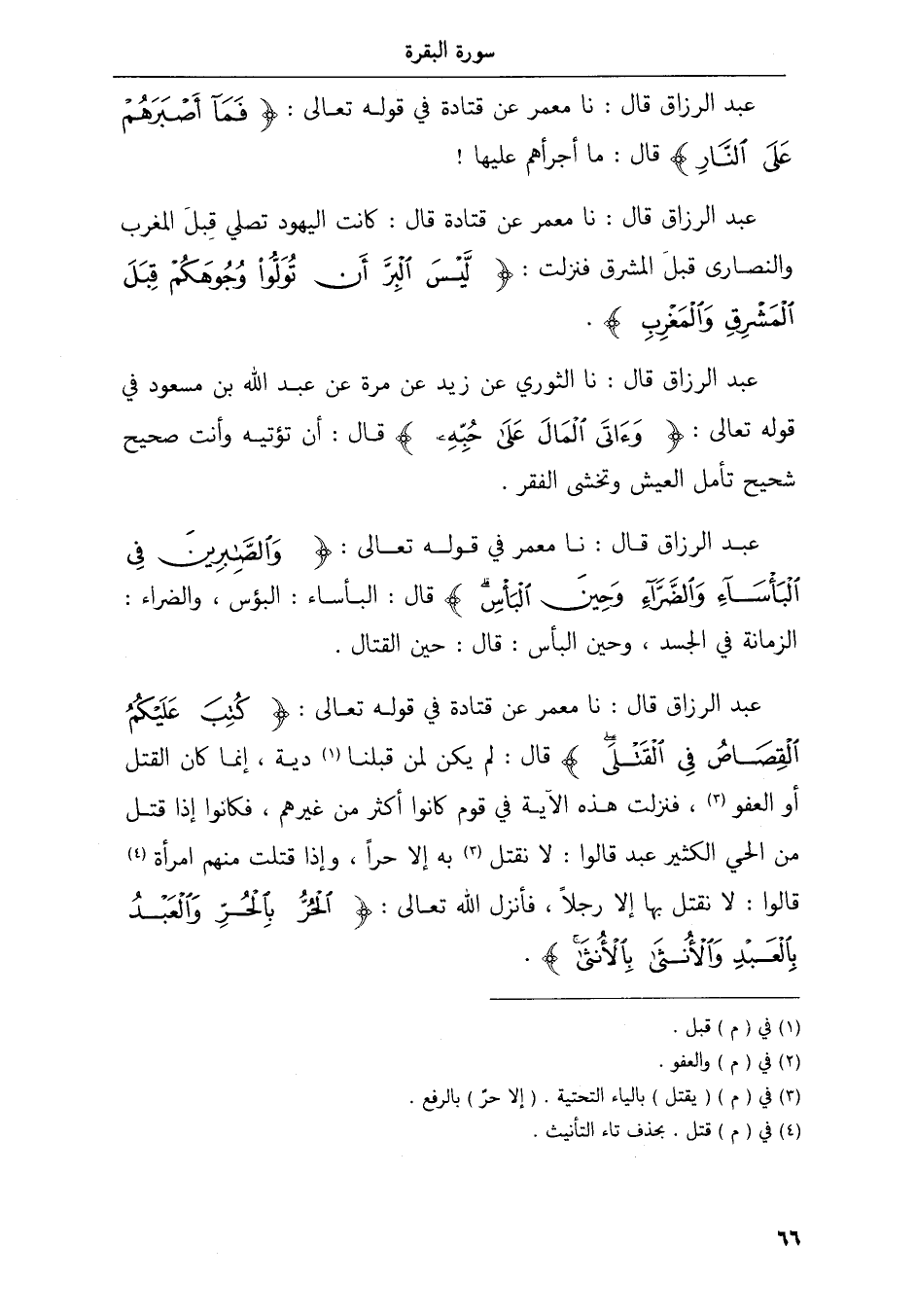 عبد الرزاق قال نا معمر عن قتادة في قوله تعالى كتب عليكم القصاص في القتلى قال لم يكن لمن قبلنا دية إنما كان القتل أو العفو فنزلت هذه الآية في قوم كانوا أكثر من غيرهم فكانوا إذا قتل من الحي الكثير عبد قالوا لا نقتل به إلا حرا وإذا قتلت منهم امرأة قالوا لا نقتل بها إلا رجلا فأنزل الله تعالى الحر بالحر والعبد بالعبد والأنثى بالأنثى