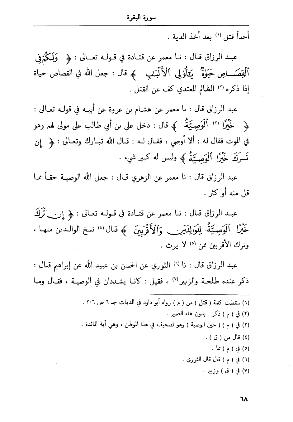 عبد الرزاق قال نا معمر عن هشام بن عروة عن أبيه في قوله تعالى خيرا الوصية قال دخل علي بن أبي طالب على مولى لهم وهو في الموت فقال ألا أوصي فقال له قال الله تبارك وتعالى إن ترك خيرا الوصية وليس له كبير شيء