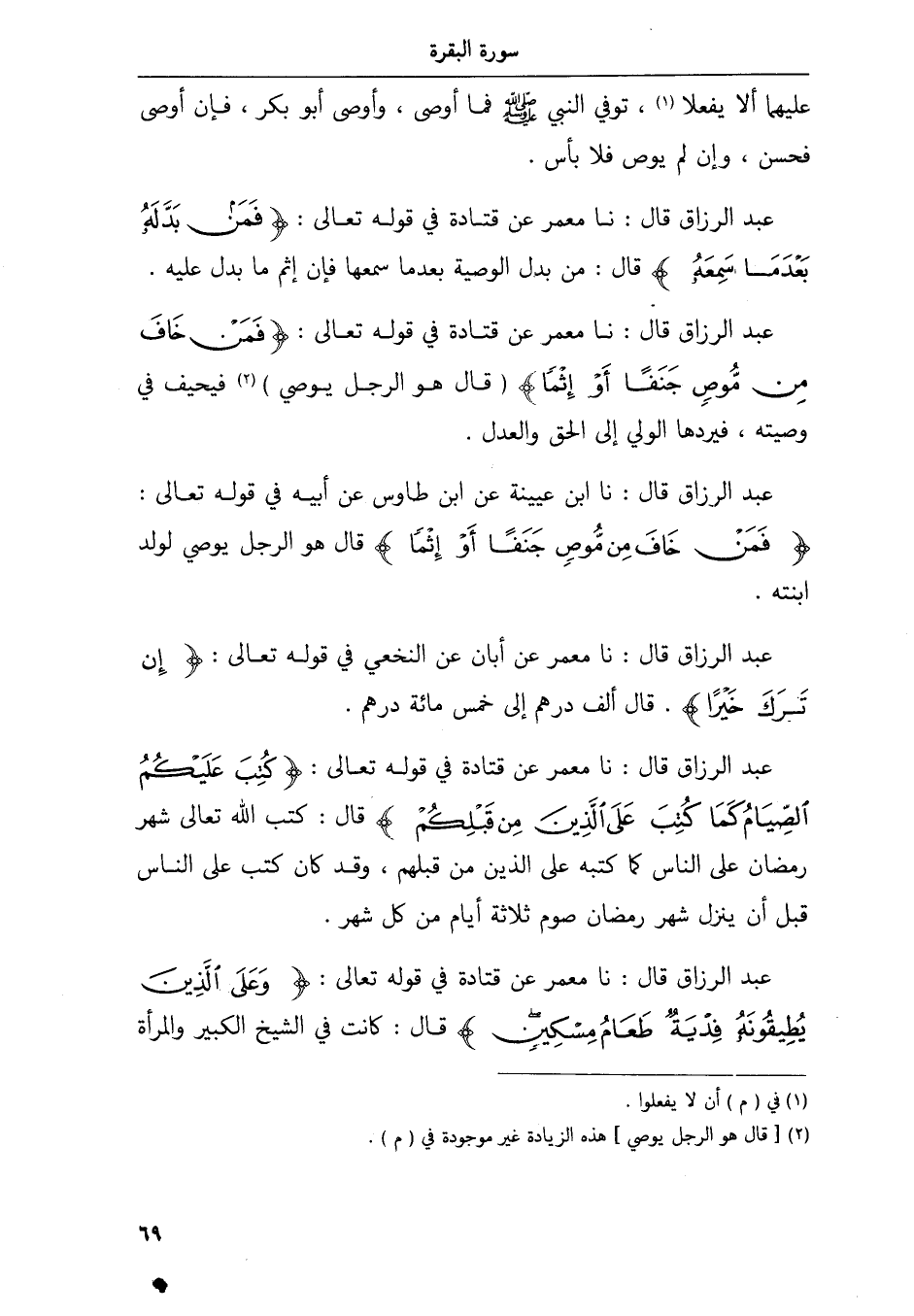 عبد الرزاق قال نا معمر عن قتادة في قوله تعالى فمن بدله بعدما سمعه قال من بدل الوصية بعدما سمعها فإن إثم ما بدل عليه