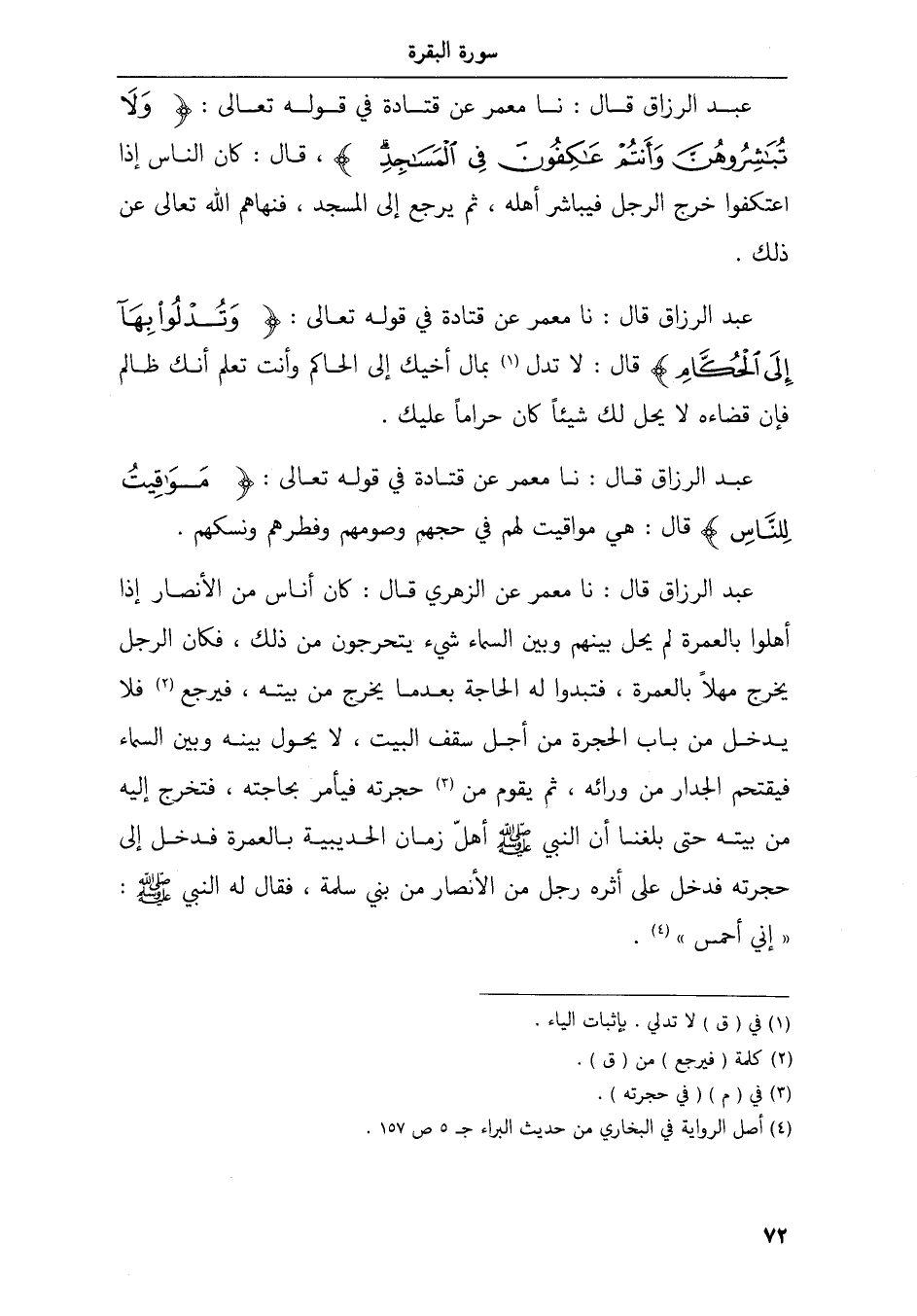 عبد الرزاق قال نا معمر عن الزهري قال كان أناس من الأنصار إذا أهلوا بالعمرة لم يحل بينهم وبين السماء شيء يتحرجون من ذلك فكان الرجل يخرج مهلا بالعمرة فتبدوا له الحاجة بعدما يخرج من بيته فيرجع فلا يدخل من باب الحجرة من أجل سقف البيت لا يحول بينه وبين السماء فيقتحم الجدار من ورائه ثم يقوم من حجرته فيأمر بحاجته فتخرج إليه من بيته حتى بلغنا أن النبي أهل زمان الحديبية بالعمرةفدخل إلى حجرته فدخل على أثره رجل من الأنصار من بني سلمة فقال له النبي إني أحمس