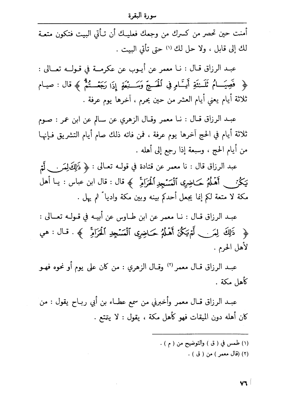 عبد الرزاق قال نا معمر عن قتادة في قوله تعالى ذلك لمن لم يكن أهله حاضرى المسجد الحرام قال قال ابن عباس يا أهل مكة لا متعة لكم إنما يجعل أحدكم بينه وبين مكة واديا ثم يهل