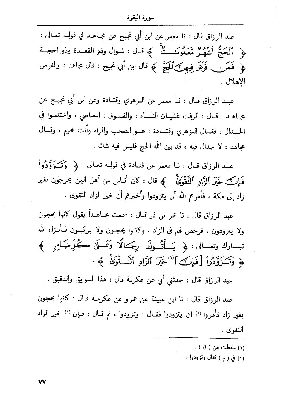 عبد الرزاق قال نا عمر بن ذر قال سمعت مجاهدا يقول كانوا يحجون ولا يتزودون فرخص لهم في الزاد وكانوا يحجون ولا يركبون فأنزل الله تبارك وتعالى يأتوك رجالا وعلى كل ضامر وتزودوا فإن خير الزاد التقوى