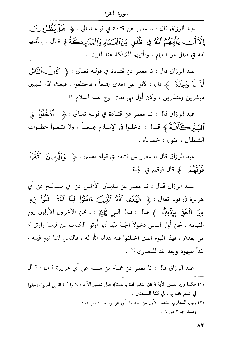 عبد الرزاق قال نا معمر عن قتادة في قوله تعالى ادخلوا في السلم كافة قال ادخلوا في الإسلام جميعا ولا تتبعوا خطوات الشيطان يقول خطاياه
