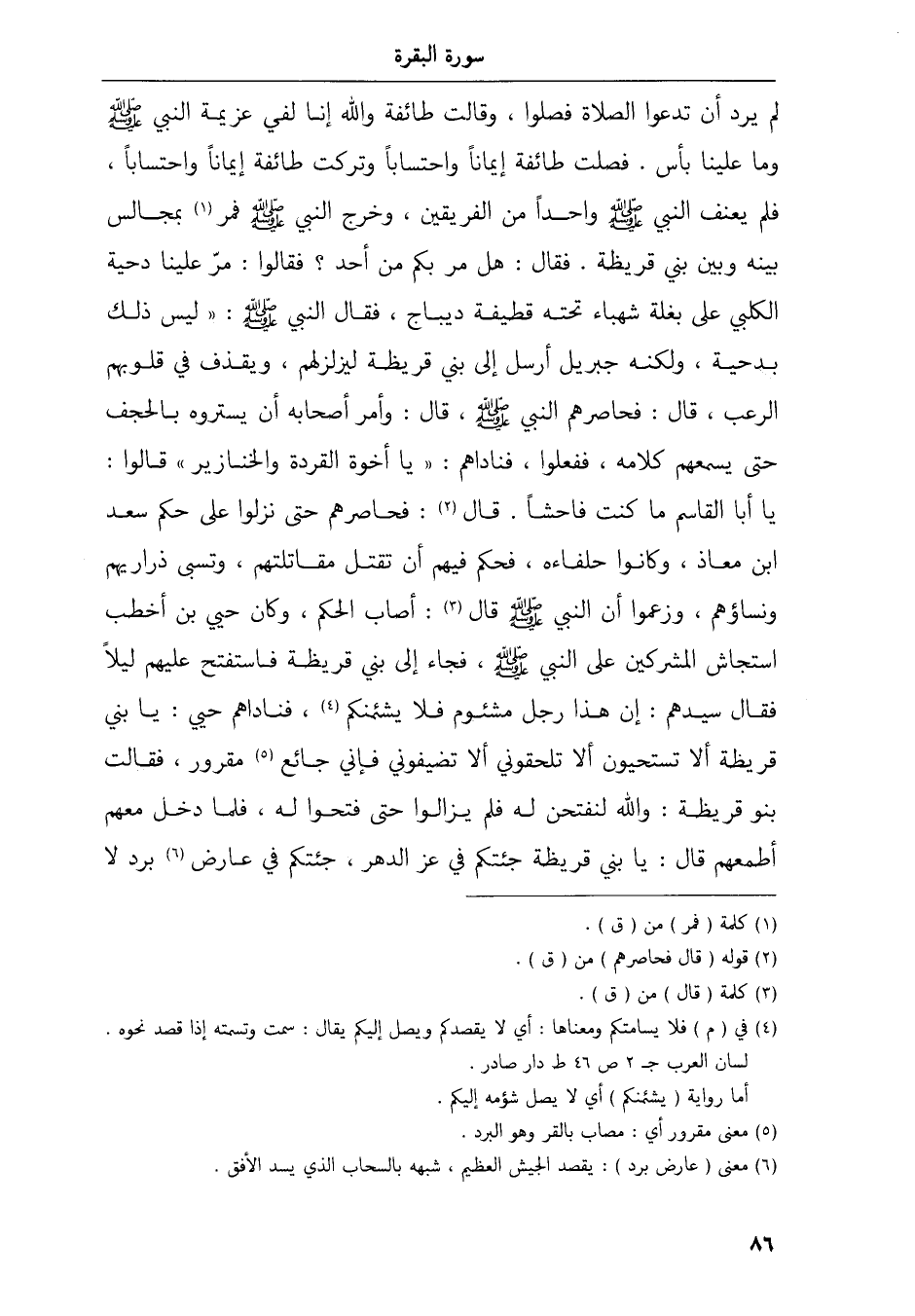لم يرد أن تدعوا الصلاة فصلوا وقالت طائفة والله إنا لفي عزيمة النبي وما علينا بأس فصلت طائفة إيمانا واحتسابا وتركت طائفة إيمانا واحتسابا فلم يعنف النبي واحدا من الفريقين وخرج النبي فمر بمجالس بينه وبين بني قريظة فقال هل مر بكم من أحد فقالوا مر علينا دحية الكلبي على بغلة شهباء تحته قطيفة ديباج فقال النبي ليس ذلك بدحية ولكنه جبريل أرسل إلى بني قريظة ليزلزلهم ويقذف في قلوبهم الرعب قال فحاصرهم النبي قال وأمر أصحابه أن يستروه بالحجف حتى يسمعهم كلامه ففعلوا فناداهم يا أخوة القردة والخنازير قالوا يا أبا القاسم ما كنت فاحشا قال فحاصرهم حتى نزلوا على حكم سعد ابن معاذ وكانوا حلفاءه فحكم فيهم أن تقتل مقاتلتهم وتسبى ذراريهم ونساؤهم وزعموا أن النبي قال أصاب الحكم وكان حيي بن أخطب استجاش المشركين على النبي فجاء إلى بني قريظة فاستفتح عليهم ليلا فقال سيدهم إن هذا الرجل مشئوم فلا يشئمنكم فناداهم حيي يا بني قريطة ألا تستحيون ألا تلحقوني ألا تضيفوني فإني جائع مقرور فقالت بنو قريظة والله لنفتحن له فلم يزالوا حتى فتحوا له فلما دخل معهم أطعمهم قال يا بني قريظة جئتكم في عز الدهر جئتكم في عارض برد لا