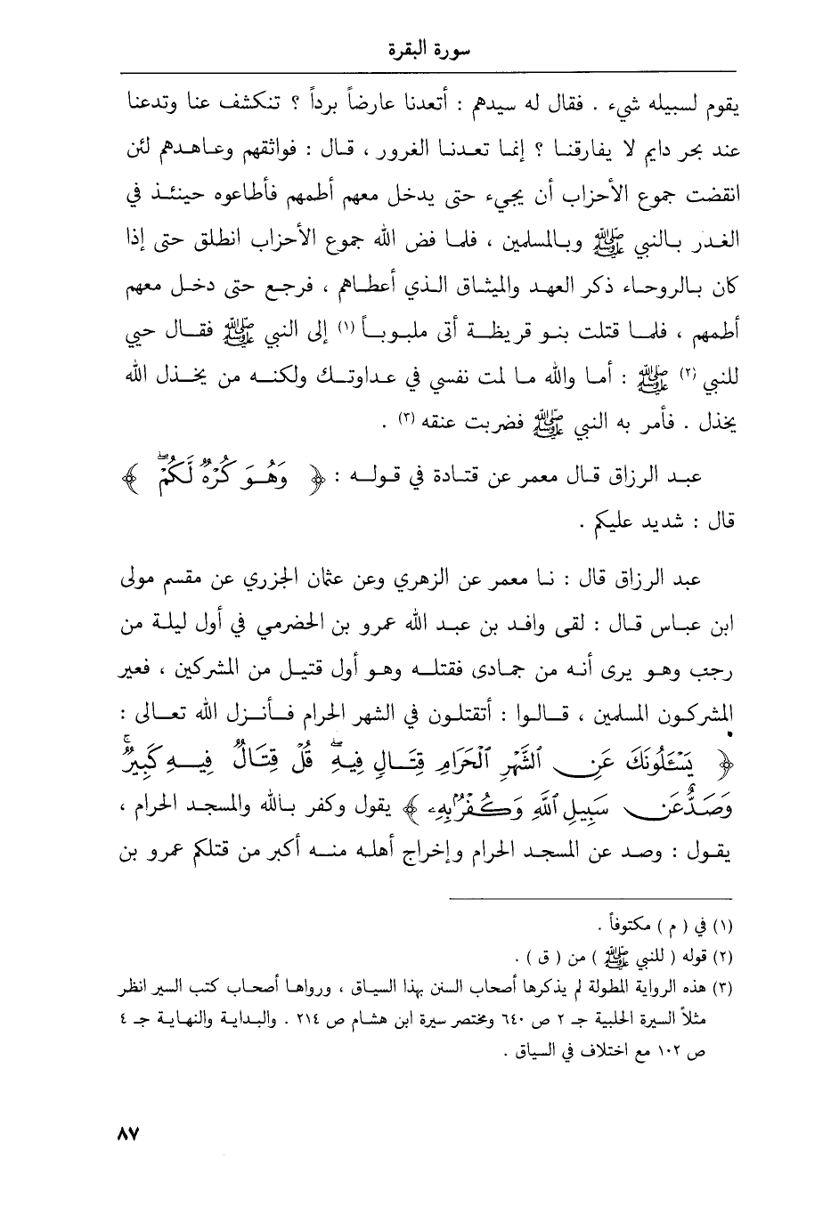 عبد الرزاق قال نا معمر عن الزهري وعن عثمان الجزري عن مقسم مولى ابن عباس قال لقى وافد بن عبد الله عمرو بن الحضرمي في أول ليلة من رجب وهو يرى أنه من جمادى فقتله وهو أول قتيل من المشركين غير المشركون المسلمين قالوا أتقتلون في الشهر الحرام فأنزل الله تعالى يسئلونك عن الشهر الحرام قتال فيه قل قتال فيه كبير وصد عن سبيل الله وكفر به يقول وكفر بالله والمسجد الحرام يقول وصد عن المسجد الحرام وإخراج أهله منه أكبر من قتلكم عمرو بن