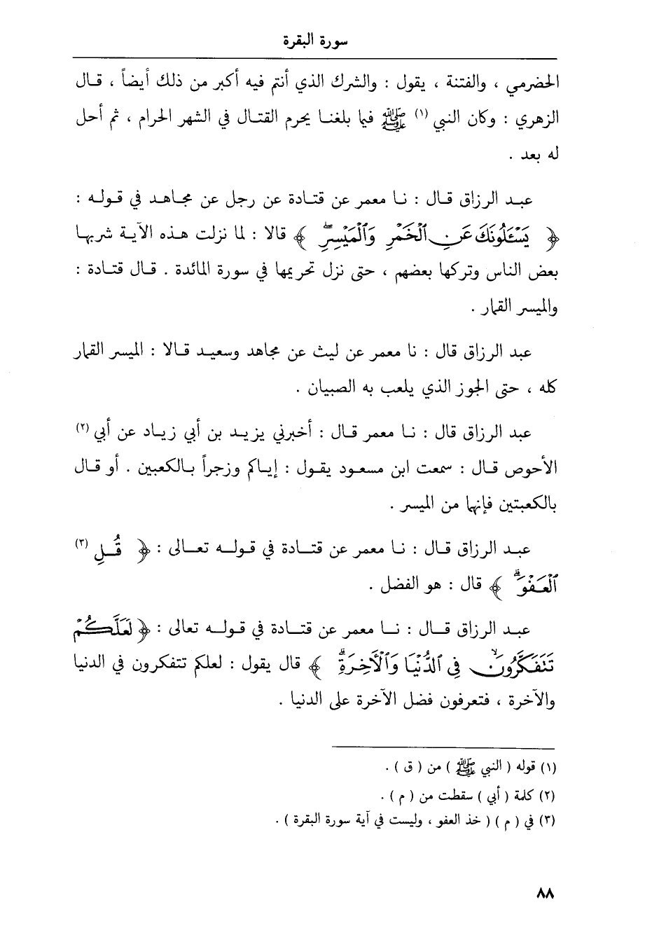 عبد الرزاق قال نا معمر عن قتادة في قوله تعالى قل العفو قال هو الفضل