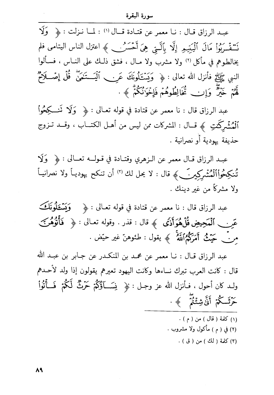 عبد الرزاق قال نا معمر عن قتادة قال لما نزلت ولا تقربوا مال اليتيم إلا بالتى هى أحسن اعتزل الناس اليتامى فلم يخالطوهم في مأكل ولا مشرب ولا مال فشق ذلك على الناس فسألوا النبي فأنزل الله تعالى ويسئلونك عن اليتمى قل إصلاح لهم خير وإن تخالطوهم فإخونكم