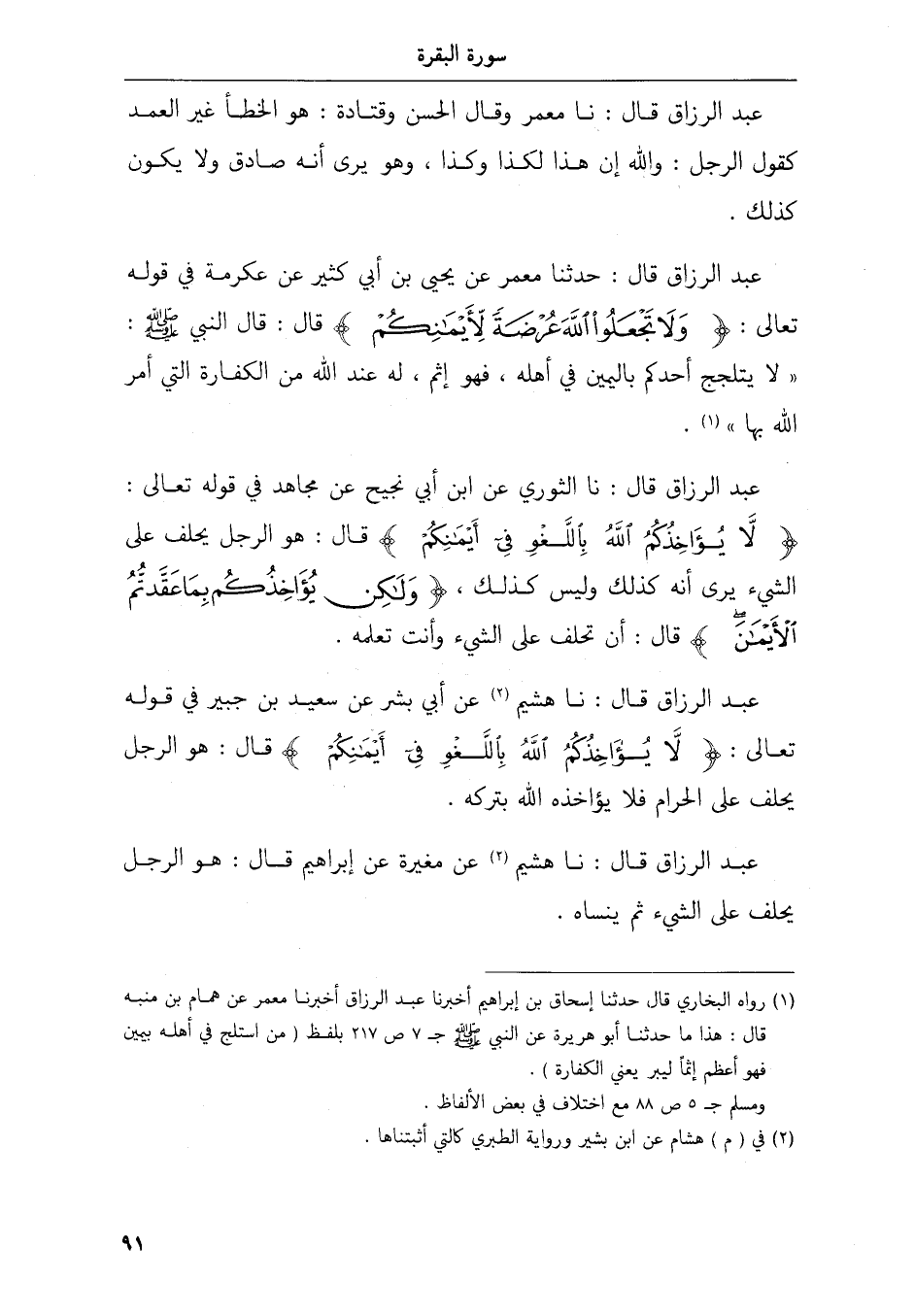 عبد الرزاق قال حدثنا معمر عن يحيى بن أبي كثير عن عكرمة في قوله تعالى ولا تجعلوا الله عرضة لأيمنكم قال قال النبي لا يتلجج أحدكم باليمين في أهله فهو إثم له عند الله من الكفارة التي أمر الله بها