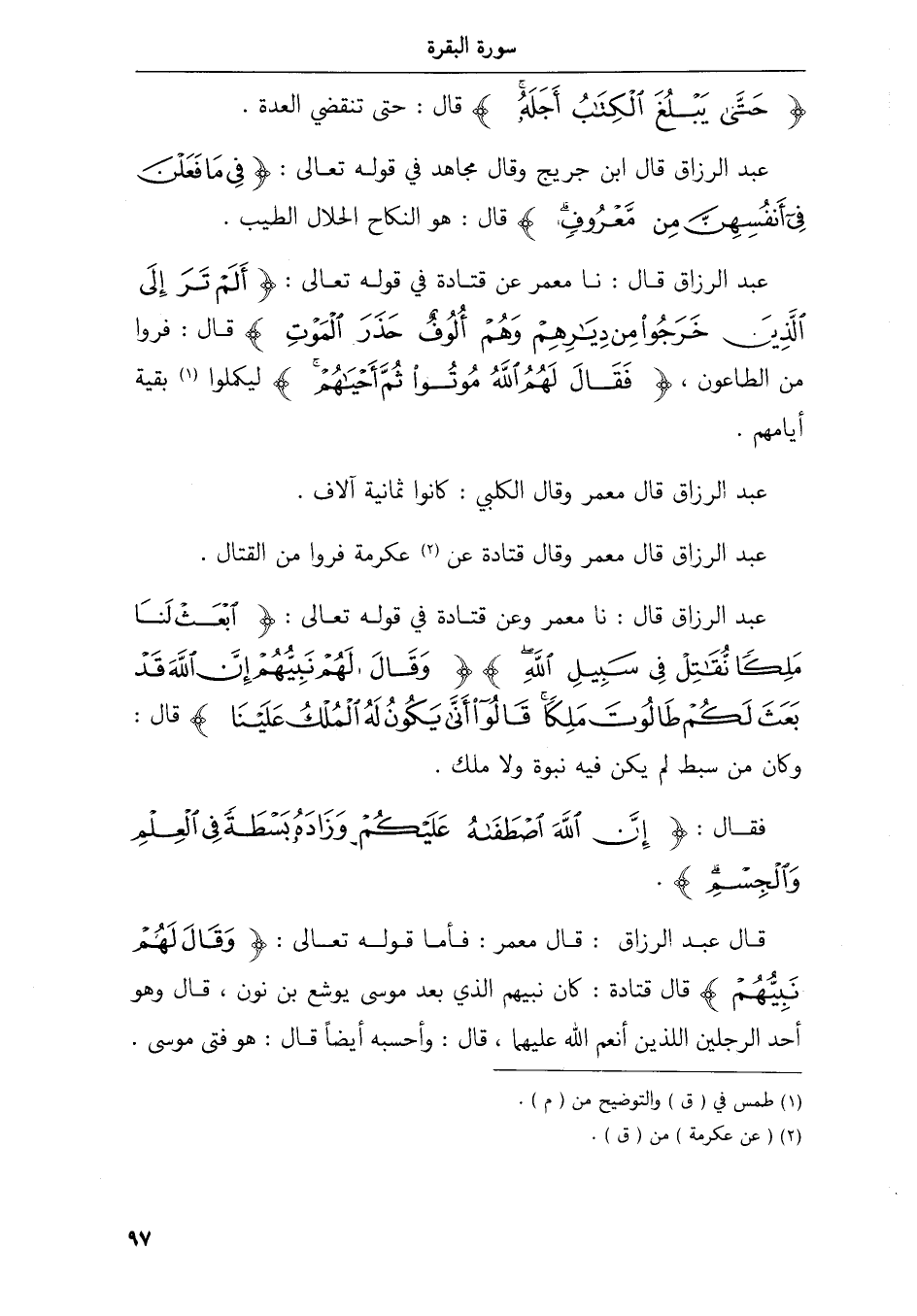 عبد الرزاق قال نا معمر وعن قتادة في قوله تعالى ابعث لنا ملكا نقتل في سبيل الله وقال لهم نبيهم إن الله قد بعث لكم طالوت ملكا قالوا أنى يكون له الملك علينا قال وكان من سبط لم يكن فيه نبوة ولا ملك