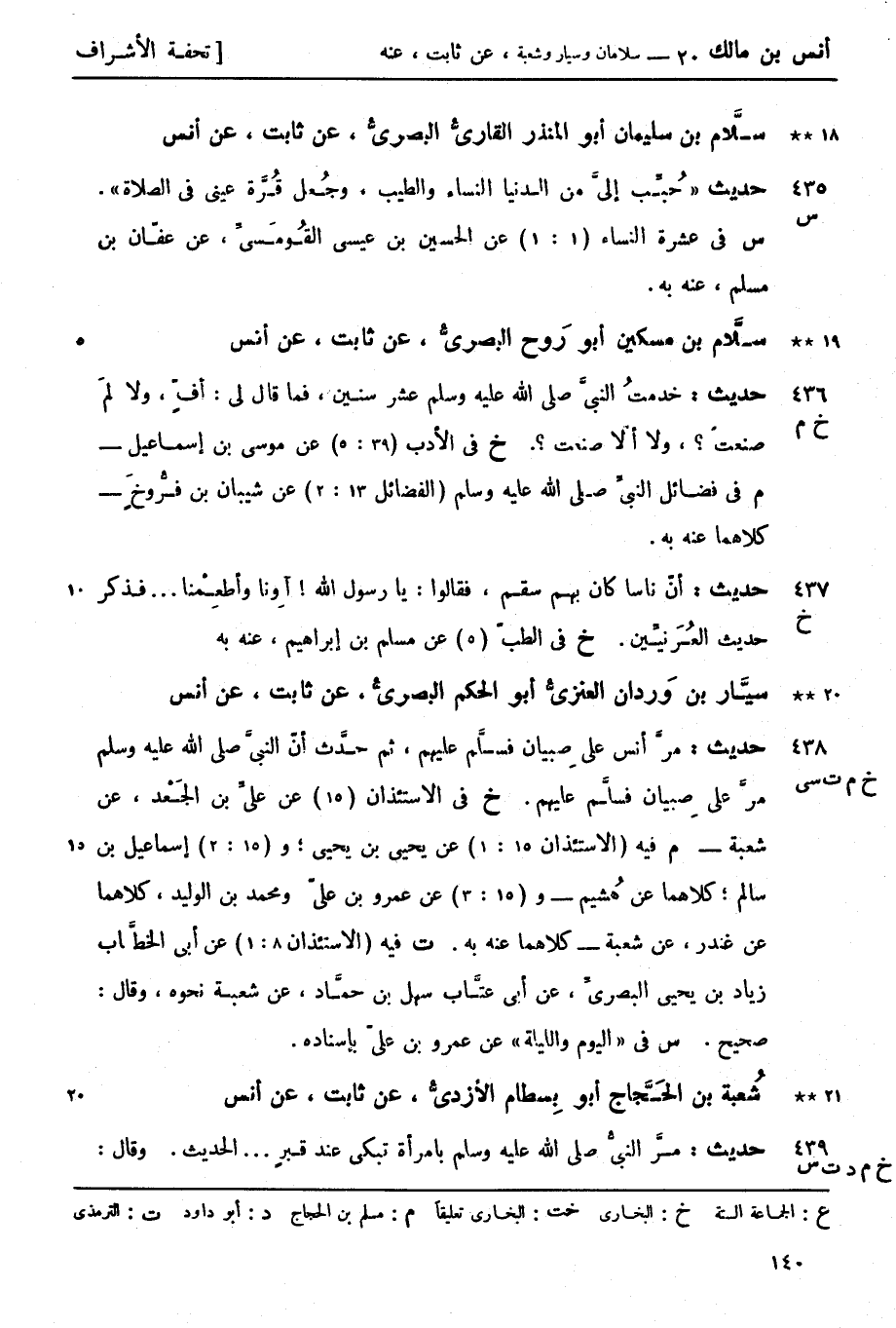 436 -[خ م] حديث خدمتُ النبيَّ صَلَّى اللَّهُ عَلَيْهِ وَسَلَّمَ عشر سنين فما قال لي أفٍّ ولا لِمَ صنعتَ ولا ألا صنعت (خ) في الأدب (39: 5) عن موسى بن إسماعيل