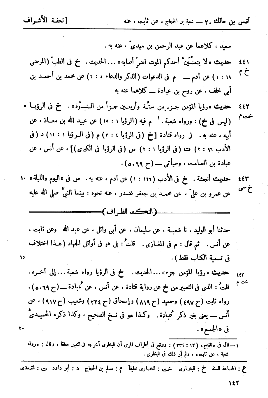 442 -[خت م] حديث رؤيا المؤمن جزءٍ من ستة وأربعين جزءاً من النبوَّة (خ) في الرؤيا (ليس في خ) ورواه شعبة 1