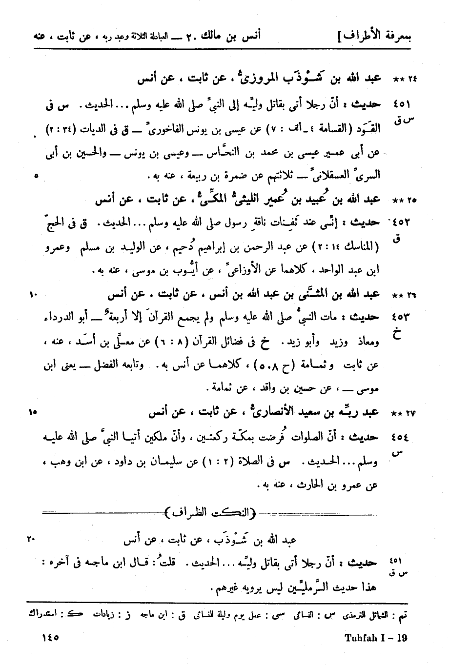 453 -[خ] حديث مات النبيُّ صَلَّى اللَّهُ عَلَيْهِ وَسَلَّمَ ولم يجمع القرآنَ إلا أربعةٌ أبو الدرداء ومعاذ وزيد وأبو زيد (خ) في فضائل القرآن (8: 6) عن معلَّى بن أسَد عنه عن ثابت وثمامة (ح 508) كلاهما عن أنس به وتابعه الفضل يعني ابن موسى عن حسين بن واقد عن ثمامة