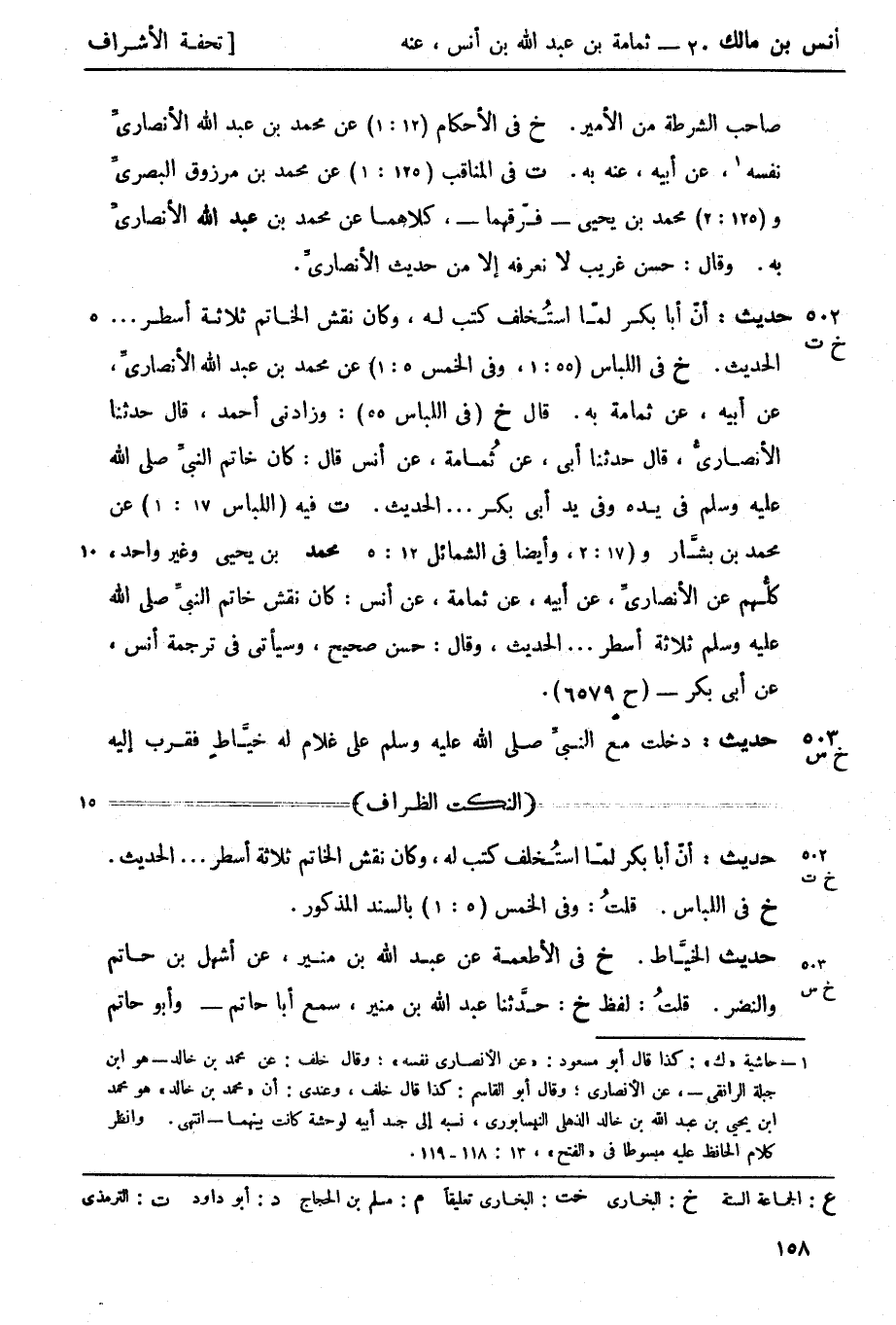 ت فيه (اللباس 17: 1) عن محمد بن بشَّار و (17: 2، وأيضا في الشمائل 12: 5) عن محمد بن يحيى وغير واحد كلُّهم عن الأنصاريِّ، عن أبيه، عن ثمامة، عن أنس: كان نقش خاتم النبيِّ صَلَّى اللَّهُ عَلَيْهِ وَسَلَّمَ ثلاثة أسطر.... الحديث، وقال: حسن صحيح، وسيأتي في ترجمة أنس، عن أبي بكر - (ح 6579)