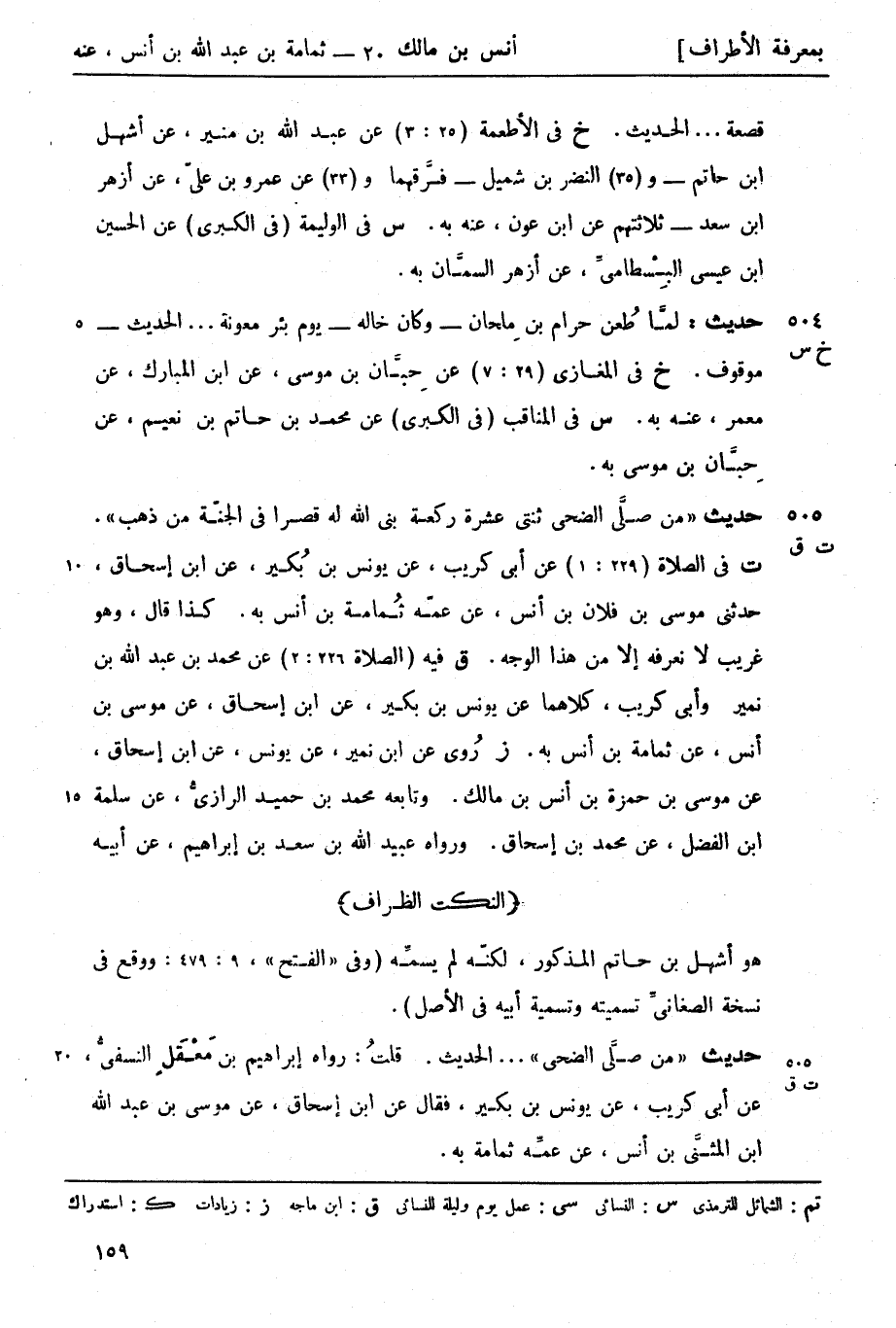 505 -[ت ق] حديث من صلَّى الضحى ثنتي عشرة ركعة بنى الله له قصراً في الجنَّة من ذهب (ت) في الصلاة (229: 1) عن أبي كريب، عن يونس بن بُكير، عن ابن إسحاق حدثني موسى بن فلان بن أنس، عن عمّه ثُمامة بن أنس به. كذا قال، وهو غريب لا نعرفه إلا من هذا الوجه.