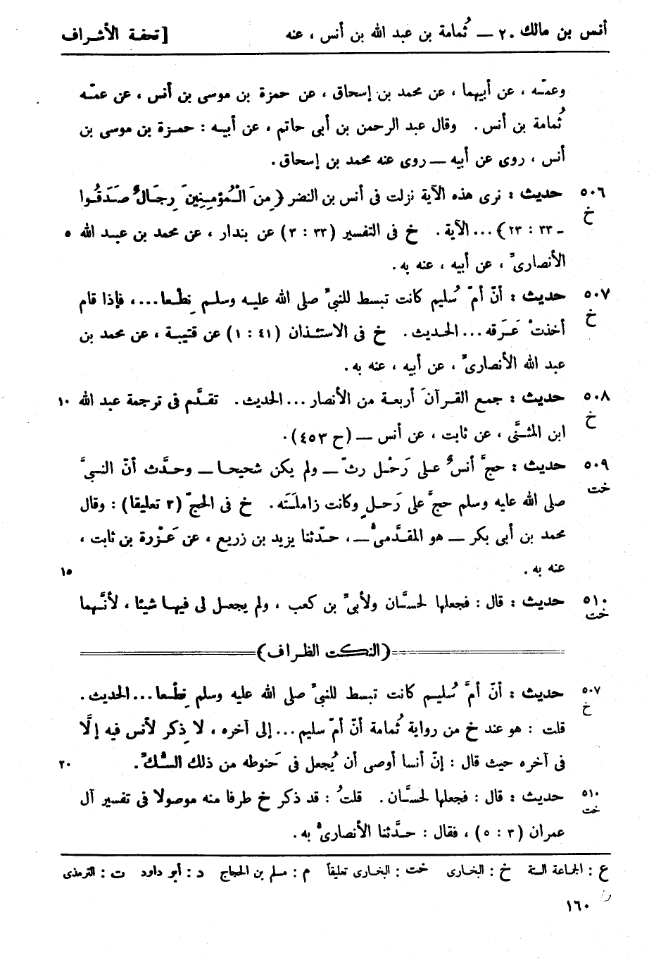 خ في الوصايا (10 تعليقاً) عقيب حديث مالك، عن إسحاق، عن أنس: كان أبو طلحة أكثر أنصاريٍّ بالمدينة مالاً. وقال الأنصاريُّ، حدَّثني أبي، عن ثمامة به.