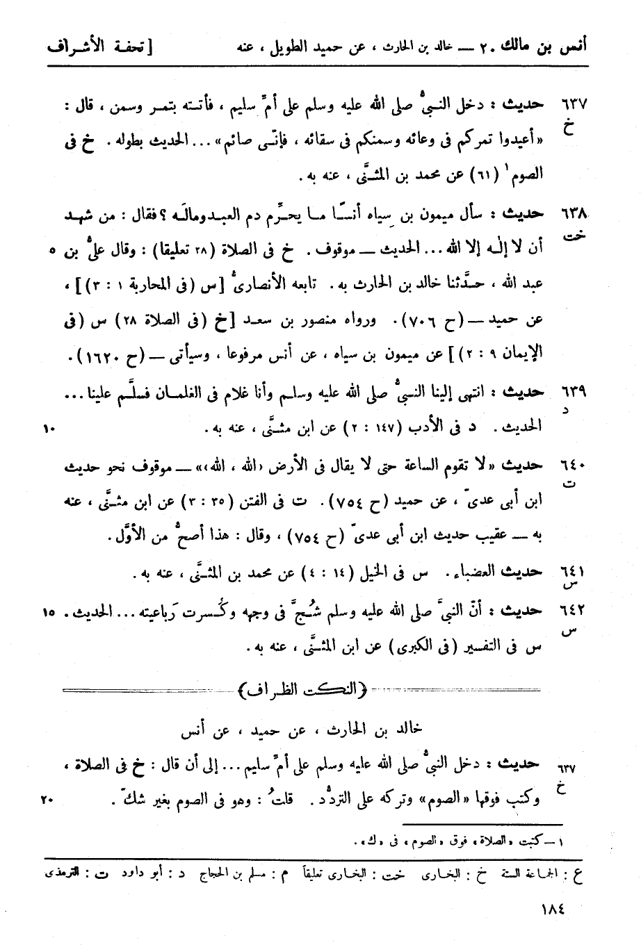 خ في الصلاة (28 تعليقاً) : وقال عليُّ بن عبد الله، حدَّثنا خالد بن الحارث به، تابعه الأنصاريُّ [س (في المحاربة 1: 3) ] عن حميد - (ح 706) . ورواه منصور بن سعد [خ (في الصلاة 28)