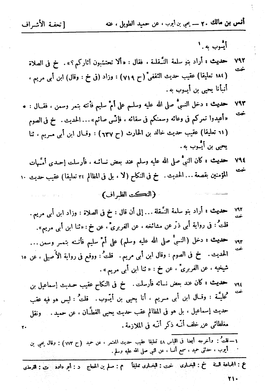 792 -[خت] حديث أراد بنو سلمة النقلة فقالألا تحتسبون آثاركم؟ (خ) في الصلاة (184 تعليقاً) عقيب حديث الثقفيِّ (ح 719) وزاد (في خ وقال) ابن أبي مريم أنبأنا يحيى بن أيوب به.