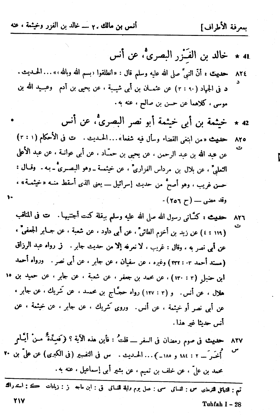 826 -[ت] حديث: كنَّاني رسول الله صَلَّى اللَّهُ عَلَيْهِ وَسَلَّمَ ببقلة كنت أجتنيها. (ت) في المناقب (119: 4) عن زيد بن أخزم الطائيِّ عن أبي داود عن شعبة عن جابر الجعفيِّ عن أبي نصر به وقال غريب لا نعرفه إلا من حديث جابر (ز) رواه عبد الرزاق (مسند أحمد 3: 232) وغيره، عن سفيان، عن جابر، عن أبي نصر، ورواه أحمد بن حنبلٍ (3: 130) عن محمد بن جعفر، عن شعبة، عن جابر، عن حميد بن هلال، عن أنس و (3: 127) رواه حجَّاج بن محمد، عن شَريك، عن جابر، عن أبي نصر أو خيثمة، عن أنس، وروى شَريك، عن جابر، عن خيثمة، عن أنس، حديثاً غير هذا.