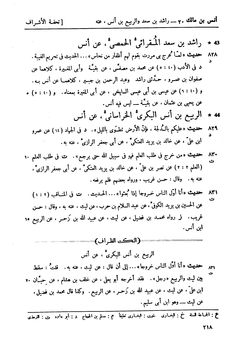 ت في المناقب (2: 1) عن الحسين بن يزيد الكوفيِّ عن عبد السلام بن حرب عن ليث عنه به. وقال حسن غريب (ز) رواه محمد بن فضيل عن ليث عن عبيد الله بن زَحر عن الربيع بن أنس.