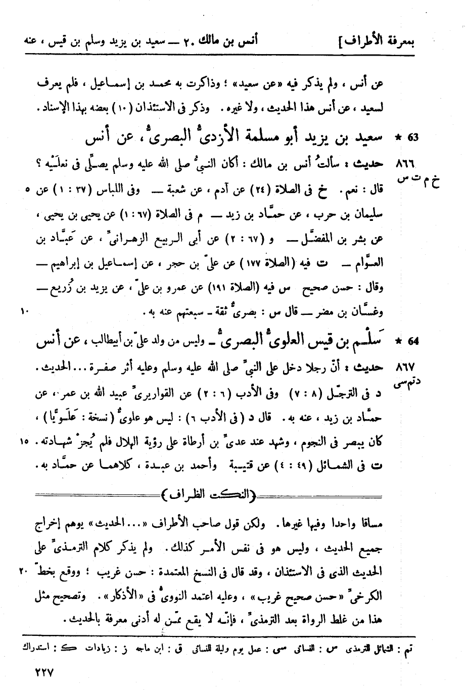 866 -[خ م ت س] حديث: سألتُ أنس بن مالك أكان النبيُّ صَلَّى اللَّهُ عَلَيْهِ وَسَلَّمَ يصلِّي في نعلَيْه؟ قال: نعم (خ) في الصلاة (24) عن آدم عن شعبة وفي اللباس (37: 1) عن سليمان بن حرب عن حمَّاد بن زيد