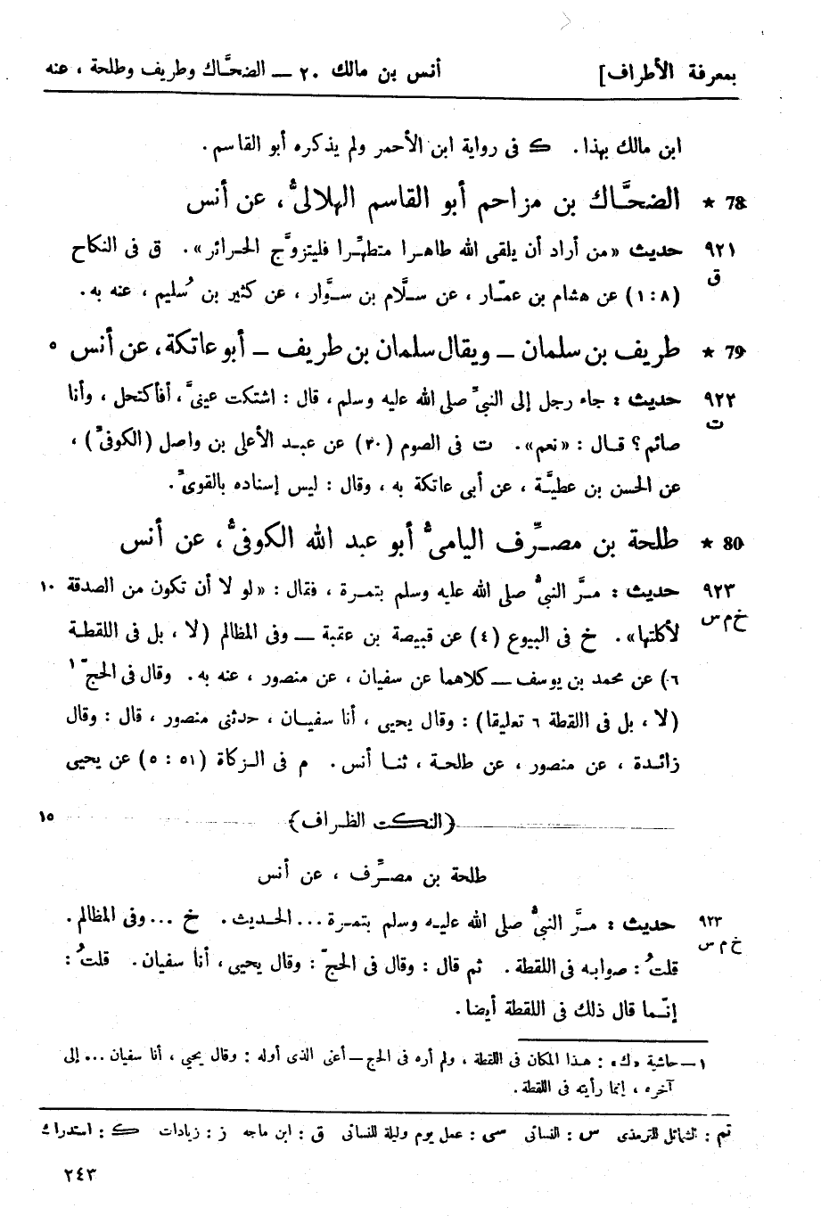 923 -[خ م س] حديث: مرَّ النبيُّ صَلَّى اللَّهُ عَلَيْهِ وَسَلَّمَ بتمرة فقال لولا أن تكون من الصدقة لأكلتها (خ) في البيوع (4) عن قبيصة بن عقبة وفي المظالم (لا بل في اللقطة 6) عن محمد بن يوسف كلاهما عن سفيان، عن منصور، عنه به. وقال في الحجّ 1 (لا بل في اللقطة 6 تعليقاً) وقال يحيى أنا سفيان حدثني منصور قال: وقال زائدة، عن منصور، عن طلحة، ثنا أنس