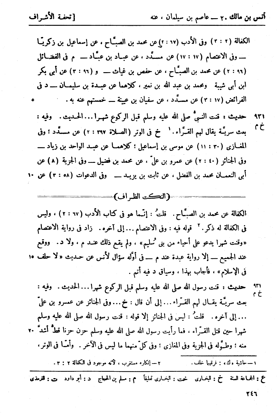 خ في الوتر (الصلاة 397: 2) عن مسدَّد وفي المغازي (30: 11) عن موسى بن إسماعيل، كلاهما عن عبد الواحد بن زياد وفي الجنائز (40: 2) عن عمرو بن عليّ، عن محمد بن فضيل - وفي الجزية (8) عن أبي النعمان محمد بن الفضل، عن ثابت بن يزيد - وفي الدعوات (58: 3) عن -[247]- الحسن بن الربيع، عن أبي الأحوص -