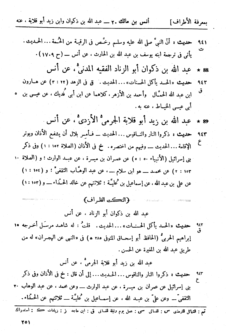 خ في الأذان (الصلاة 152: 1) وفي ذكر بني إسرائيل (الأنبياء 50: 5) عن عمران بن ميسرة، عن عبد الوارث، و (الصلاة 153: 2) عن محمد هو ابن سلام عن عبد الوهَّاب الثقفيِّ و (154: 1) عن علي بن عبد الله عن إسماعيل ابن عُليَّة ثلاثتهم عن خالد الحذَّاء و [252]- (153: 1) عن سليمان بن حرب عن حمّاد بن زيد عن سِماك بن عطيّة عن أيّوب كلاهما عنه به.
