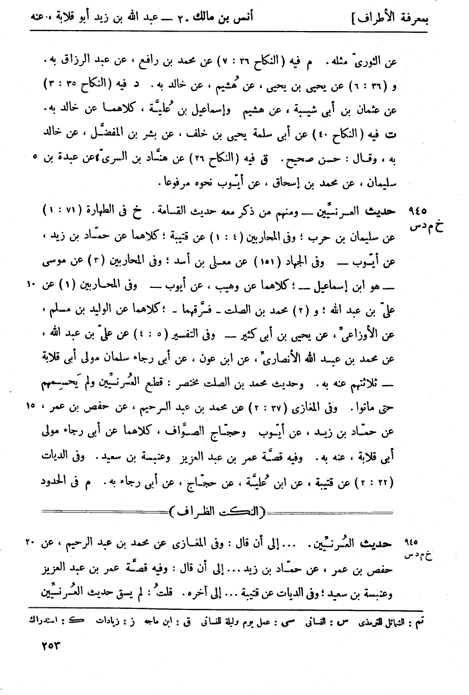 945 -[خ م د س] حديث العرنيِّين ومنهم من ذكر معه حديث القسامة (خ) في الطهارة (71: 1) عن سليمان بن حرب وفي المحاربين (4: 1) عن قتيبة كلاهما عن حمّاد بن زيد عن أيّوب وفي الجهاد (151) عن معلى بن أسد وفي المحاربين (3) عن موسى هو ابن إسماعيل كلاهما عن وهيب عن أيوب وفي المحاربين (1) عن علي بن عبد الله و (2) محمد بن الصلت فرَّقهما كلاهما عن الوليد بن مسلم عن الأوزاعيِّ عن يحيى بن أبي كثير وفي التفسير (5: 4) عن عليّ بن عبد الله عن محمد بن عبد الله الأنصاريِّ عن ابن عون عن أبي رجاء سلمان مولى أبي قلابة ثلاثتهم عنه به. وحديث محمد بن الصلت مختصر قطع العُرنيِّين ولم يَحسِمهم حتى ماتوا وفي المغازي (37: 2) عن محمد بن عبد الرحيم عن حفص بن عمر عن حمّاد بن زيد عن أيّوب وحجّاج الصوَّاف كلاهما عن أبي رجاء مولى أبي قلابة عنه به. وفيه قصَّة عمر بن عبد العزيز وعنبسة بن سعيد وفي الديات (22: 2) عن قتيبة عن ابن عُليَّة عن حجّاج عن أبي رجاء به