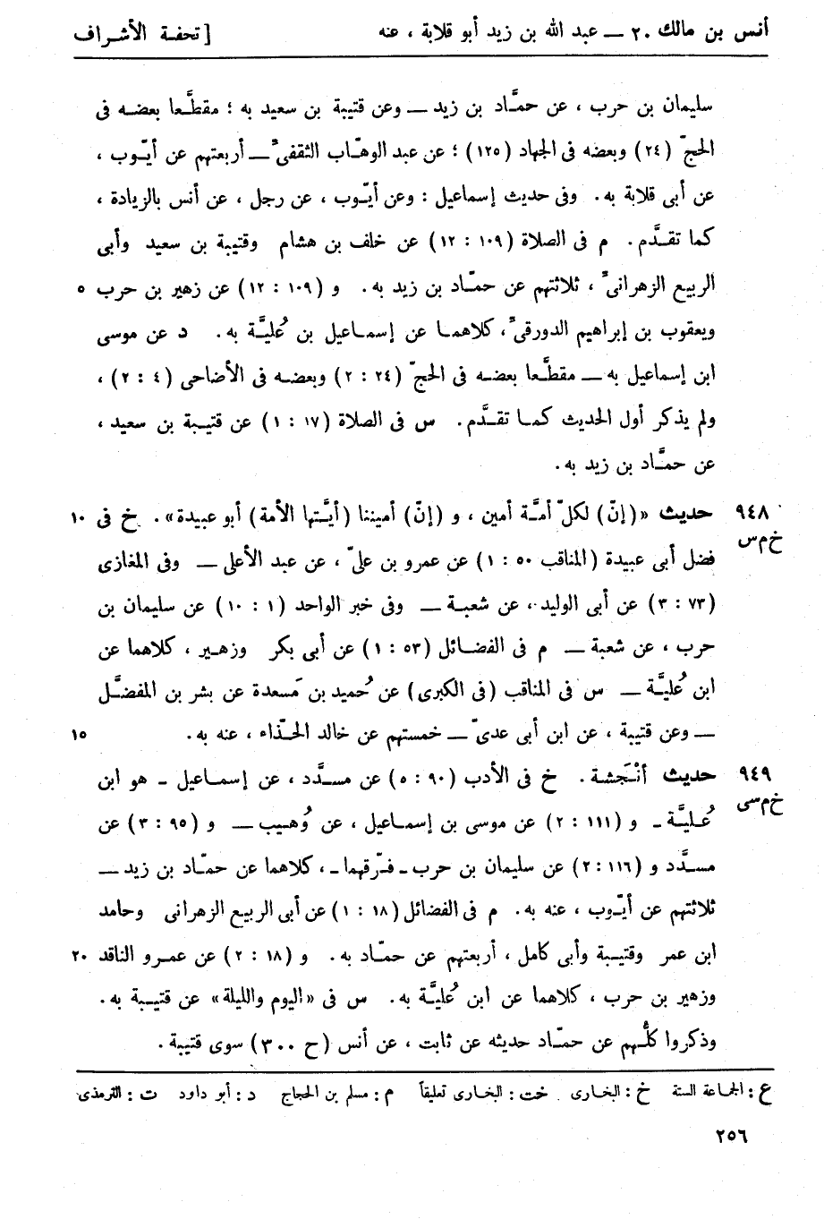 948 -[خ م س] حديث (إنّ) لكلّ أمَّة أمين و (إنّ) أميننا (أيَّتها الأمة) أبو عبيدة (خ) في فضل أبي عبيدة (المناقب 50: 1) عن عمرو بن عليّ عن عبد الأعلى وفي المغازي (73: 3) عن أبي الوليد عن شعبة وفي خبر الواحد (1: 10) عن سليمان بن حرب عن شعبة