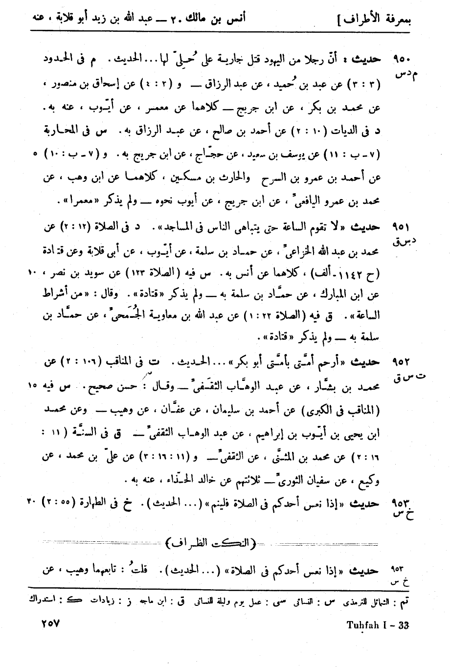 951 -[د س ق] حديث لا تقوم الساعة حتى يتباهى الناس في المساجد (د) في الصلاة (12: 2) عن محمد بن عبد الله الخزاعيِّ، عن حماد بن سلمة، عن أيّوب، عن أبي قلابة وعن قتادة (ح 1142 - ألف) كلاهما عن أنس به،
