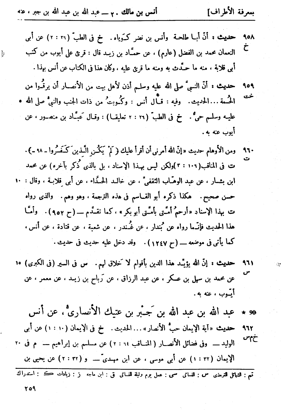 958 -[خ] حديث: أنّ أبا طلحة وأنس بن نضر كوَياه. (خ) في الطبّ (26: 2) عن أبي النعمان محمد بن الفضل (عارم) عن حمَّاد بن زيد قال: قرئ على أيوب من كتب أبي قلابة، منه ما حدَّث به ومنه ما قرئ عليه، وكان هذا في الكتاب عن أنس بهذا.