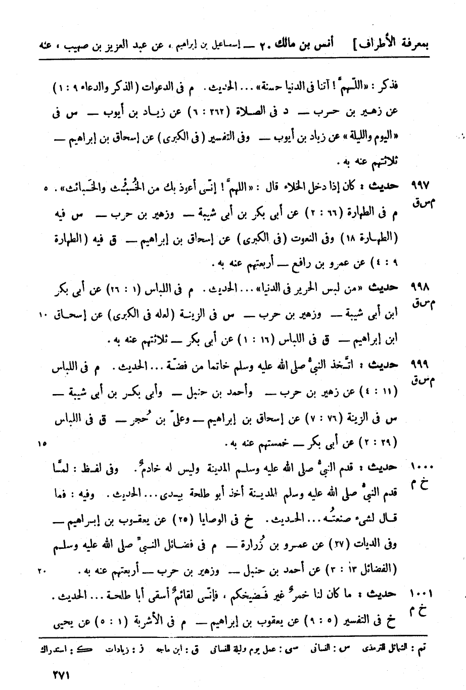 997 -[م س ق] حديث: كان إذا دخل الخلاء قال: اللهمَّ! إنّي أعوذ بك من الخُبُْث والخَبائث (م) في الطهارة (66: 2) عن أبي بكر بن أبي شيبة - وزهير بن حرب -