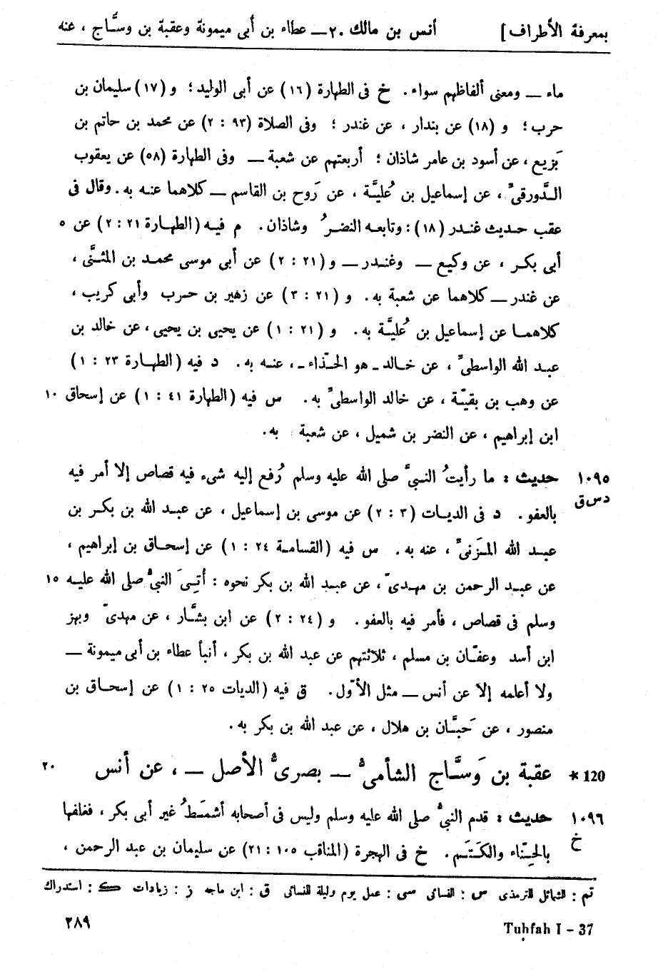 س فيه (القسامة 24: 1) عن إسحاق بن إبراهيم عن عبد الرحمن بن مهديّ عن عبد الله بن بكر نحوه أتى النبيُّ صَلَّى اللَّهُ عَلَيْهِ وَسَلَّمَ في قصاص فأمر فيه بالعفو و (24: 2) عن ابن بشَّار عن مهديّ وبهز بن أسد وعفّان بن مسلم ثلاثتهم عن عبد الله بن بكر أنبأ عطاء بن أبي ميمونة ولا أعلمه إلا عن أنس مثل الأوّل