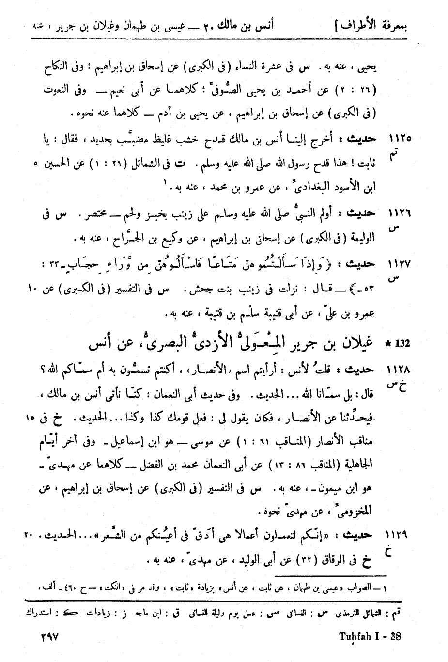 1128 -[خ س] حديث قلتُ لأنس أرأيتم اسم (الأنصار) أكنت تسمُّون به أم سمّاكم الله؟ قال بل سمّانا الله.... الحديث وفي حديث أبي النعمان كنّا نأتي أنس بن مالك فيحدِّثنا عن الأنصار فكان يقول لي فعل قومك كذا وكذا.... الحديث