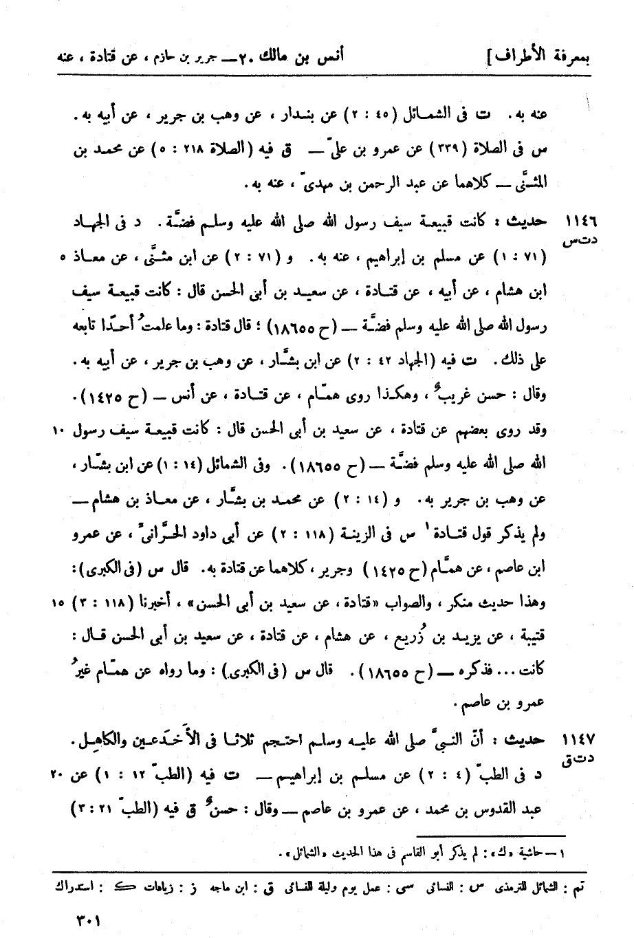 ت في (الجهاد 42: 2) عن ابن بشَّار عن وهب بن جرير عن أبيه به وقال حسن غريبٌ وهكذا روى همَّام عن قتادة عن أنس (ح 1425) وقد روى بعضهم عن قتادة عن سعيد بن أبي الحسن قال كانت قبيعة سيف رسول الله صَلَّى اللَّهُ عَلَيْهِ وَسَلَّمَ فضَّة (ح 18655) وفي الشمائل (14: 1) عن ابن بشّار عن وهب بن جرير به و (14: 2) عن محمد بن بشَّار عن معاذ بن هشام ولم يذكر قول قتادة 1