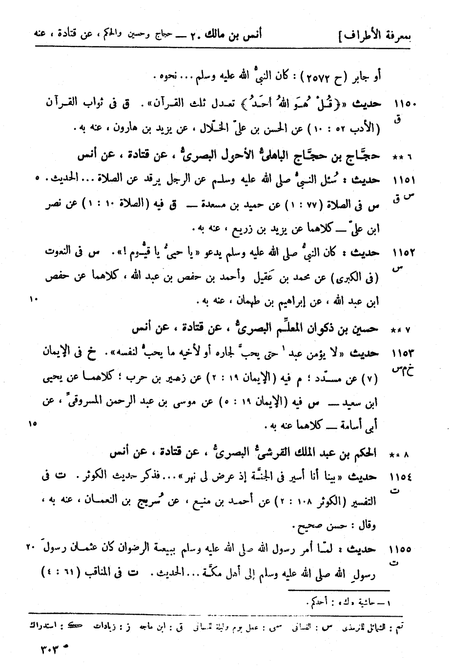 1150 -[ق] حديث قُلْ هُوَ اللهُ أحَدُ تعدل ثلث القرآن (ق) في ثواب القرآن (الأدب 52: 10) عن الحسن بن عليّ الخلاّل عن يزيد بن هارون عنه به.