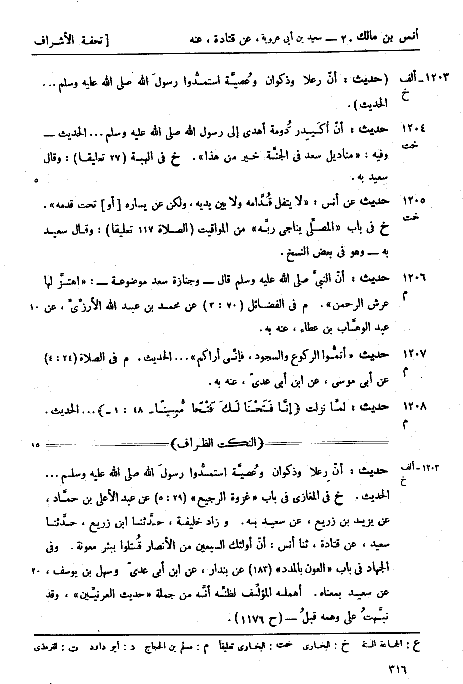 1205 -[خت] حديث عن أنس لا يتفل قُدَّامه ولا بين يديه ولكن عن يساره [أو] تحت قدمه (خ) في باب المصلِّي يناجي ربَّه من المواقيت (الصلاة 117 تعليقاً) وقال سعيد به وهو في بعض النسخ.